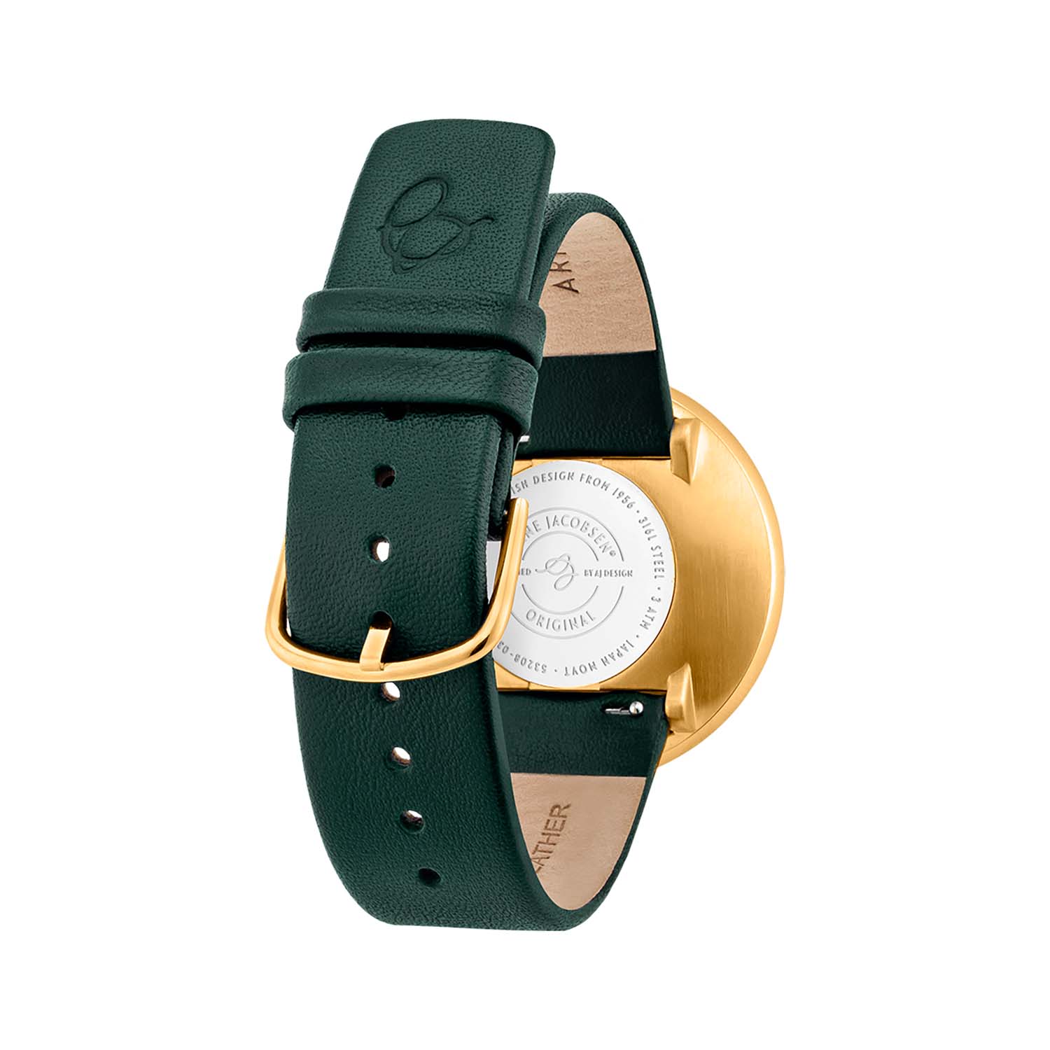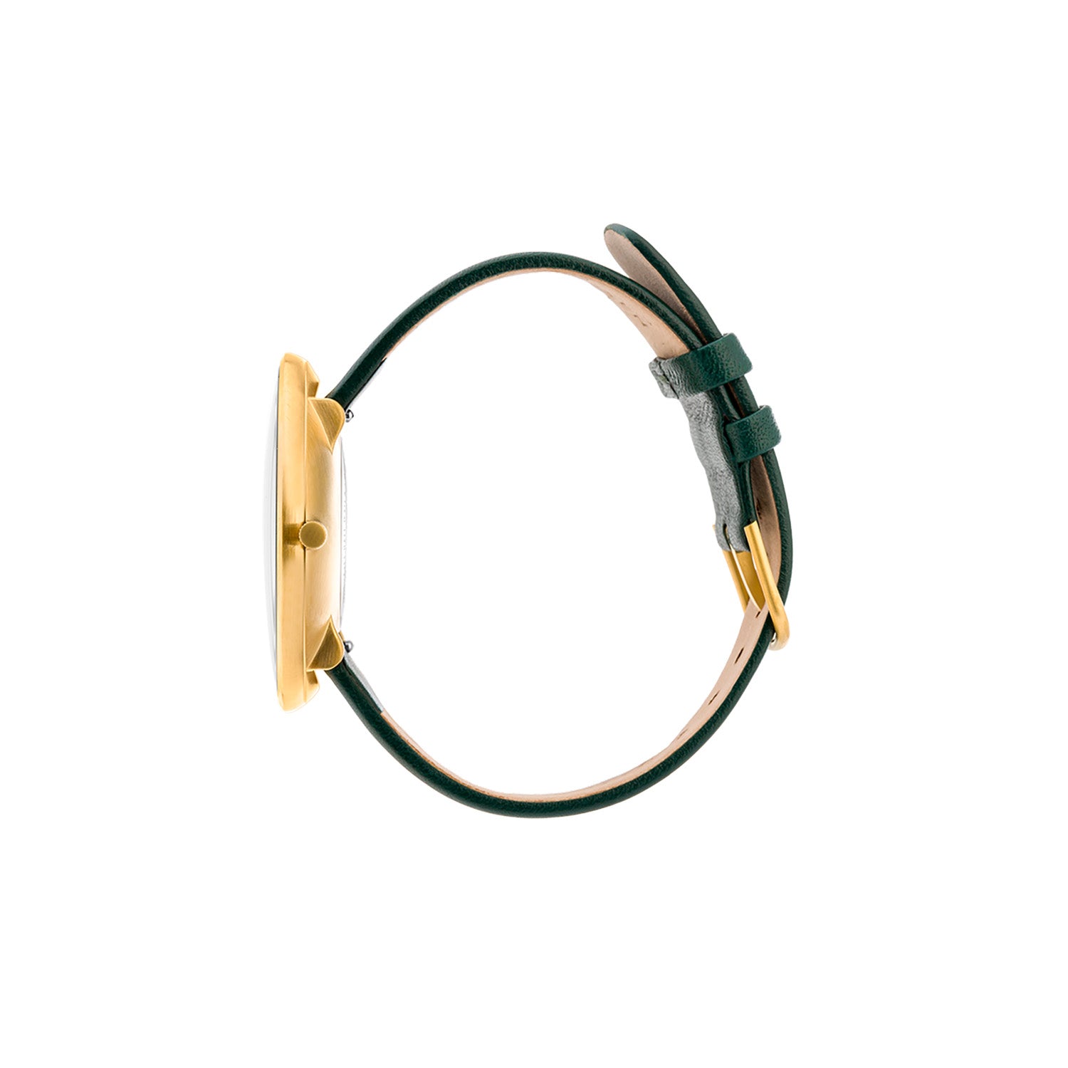 Uret har en dyb grøn urskive, der skaber en smuk kontrast til den forgyldte ramme. De enkle linjer og det rene design gør det til et statement-stykke, der tilføjer et strejf af luksus til dit håndled. Den glatte læderrem i matchende grøn farve sikrer en behagelig pasform og en følelse af raffinement.