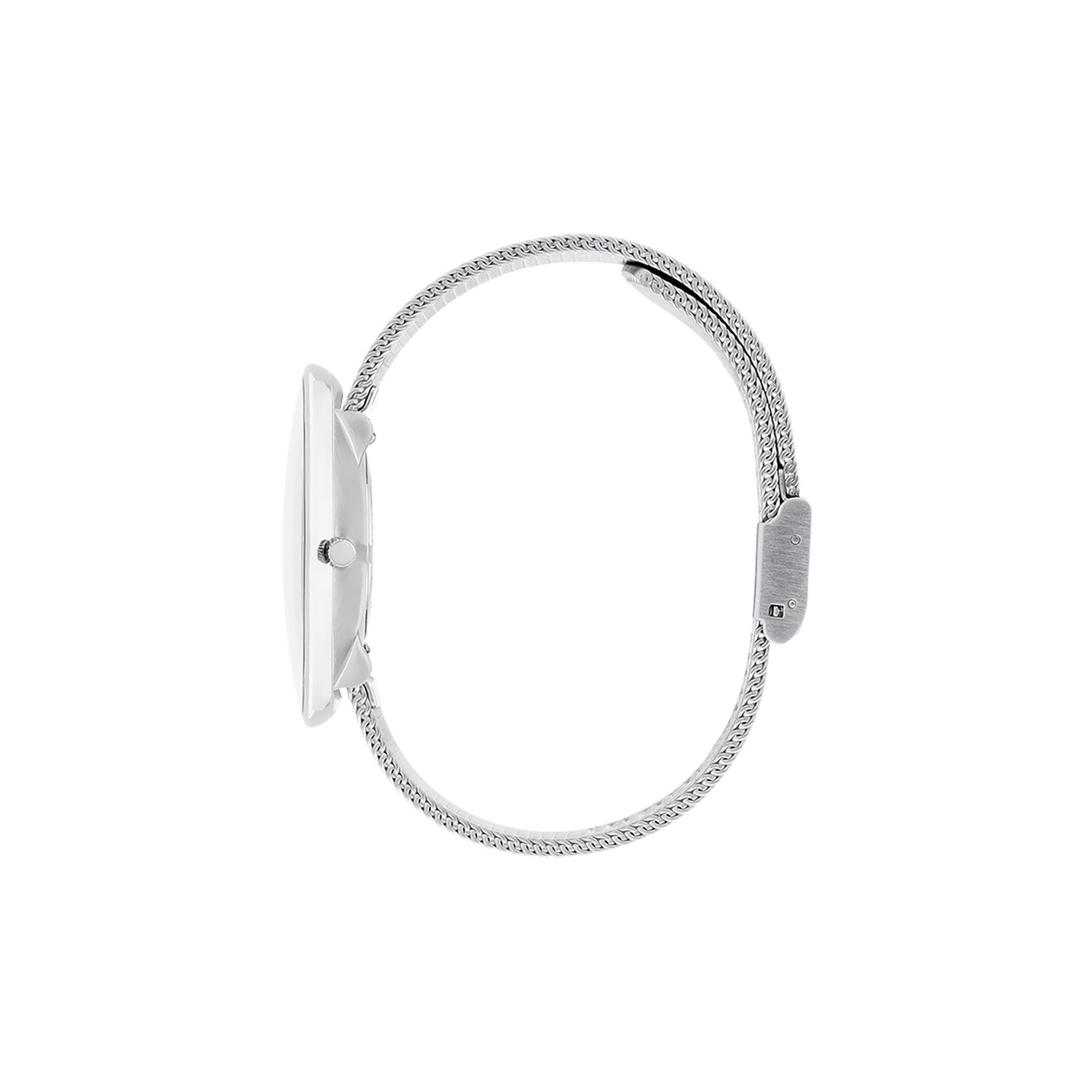 Uret har en dyb grøn urskive, der tilføjer en subtil farve til det ellers minimalistiske design. Den sølvfarvede mesh-rem giver en luksuriøs følelse og sikrer komfort hele dagen. De enkle, hvide markeringer og visere skaber en smuk kontrast mod den mørke baggrund, hvilket gør det nemt at aflæse tiden.