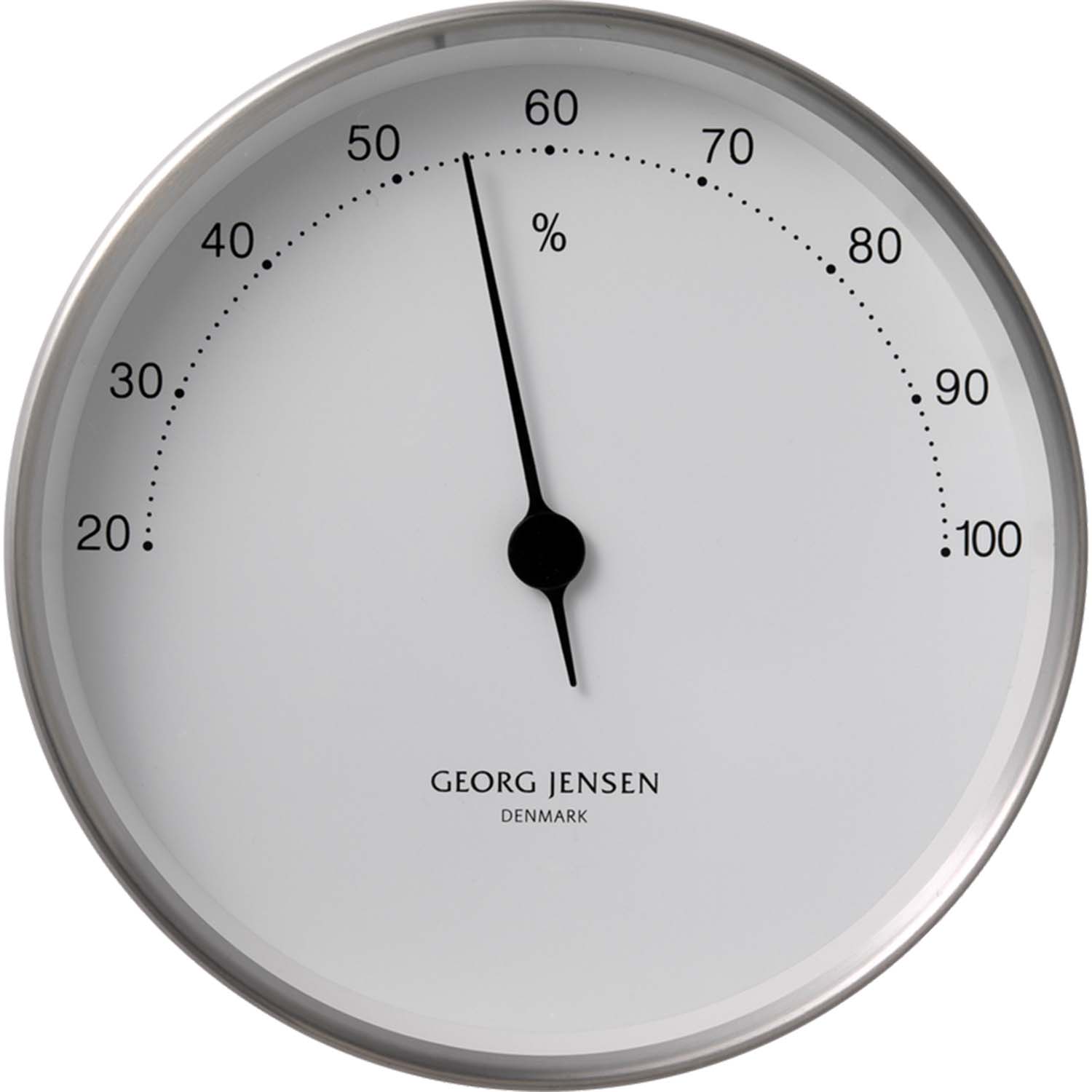 Georg Jensens hygrometer er et eksempel på skandinavisk design, hvor funktionalitet møder æstetik. Den rene hvide urskive med sorte markeringer giver et minimalistisk udtryk, der er både tidløst og moderne. Den slanke ramme i rustfrit stål tilføjer en subtil glans, der komplementerer enhver indretning.