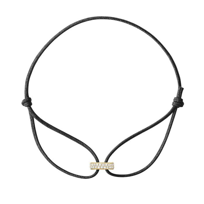 Armbåndet er udført i en smuk kombination af 18 karat guld og sort bomuldssnor, hvilket giver det et moderne og sofistikeret udtryk. Den gyldne detalje i midten tilføjer et strejf af luksus, mens den justerbare snor sikrer en perfekt pasform til dit håndled.
