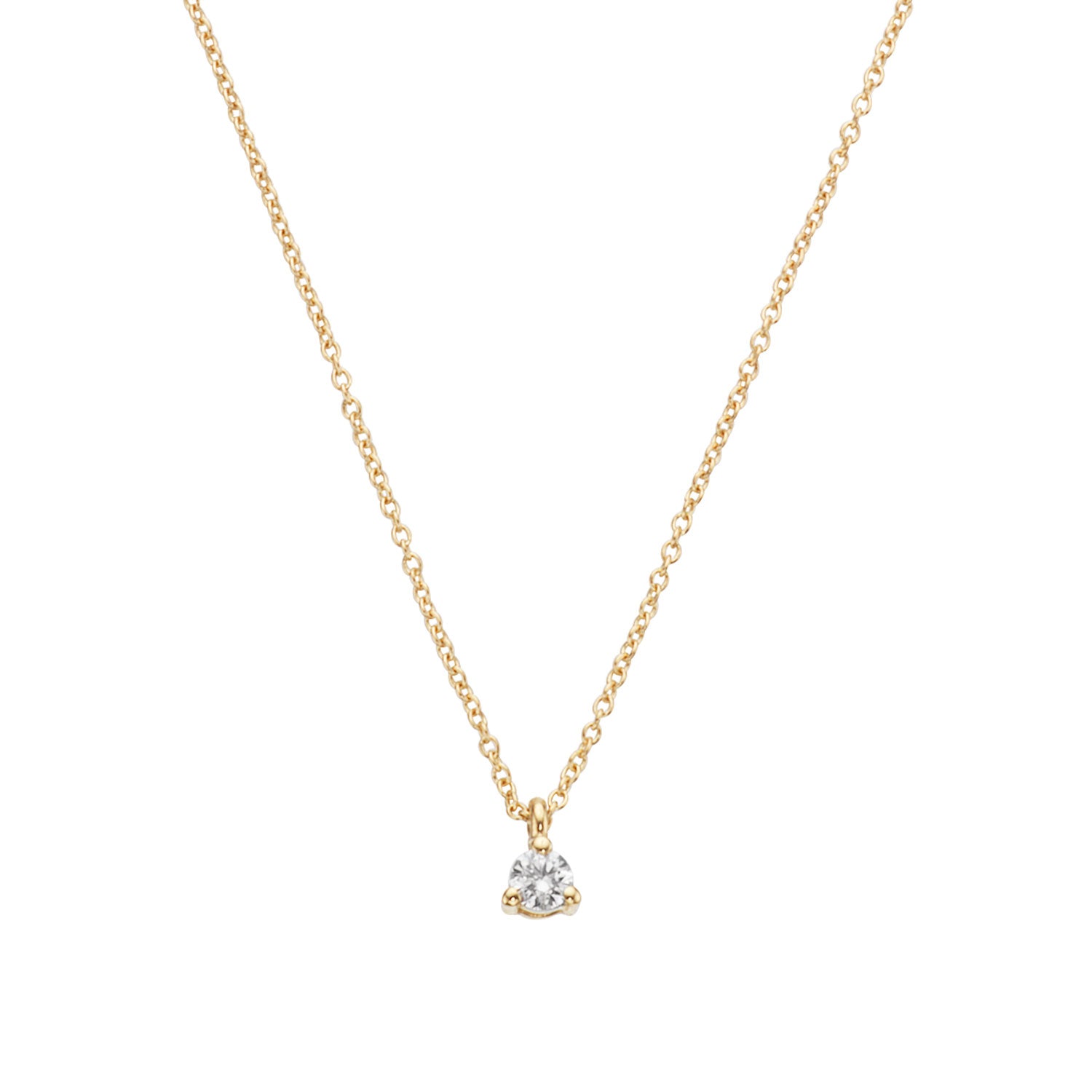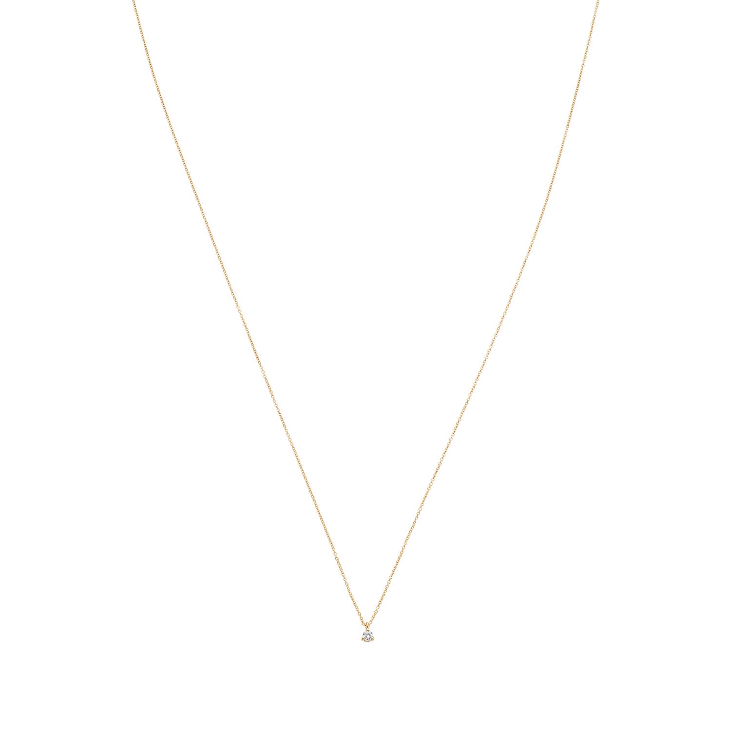 Billedet viser halskædens delikate design, hvor den gyldne kæde smyger sig elegant om halsen. Den klare diamant er omhyggeligt indfattet, hvilket giver et sofistikeret udtryk. Den varme guldtonen komplementerer diamantens klare glans, hvilket gør denne halskæde til et iøjnefaldende smykke.