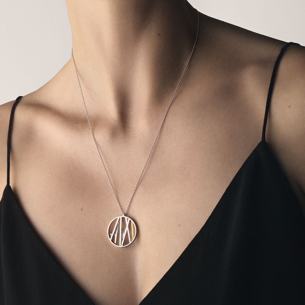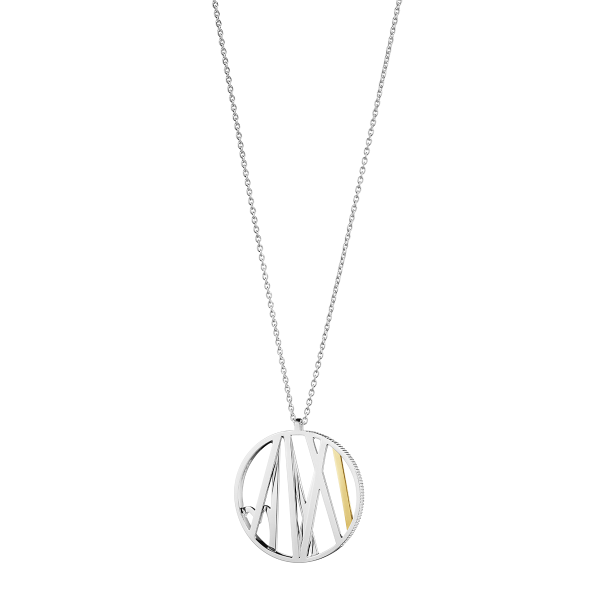 På billedet ses halskædens delikate kæde, der smukt indrammer det cirkulære vedhæng. Detaljerne i vedhænget er udført med præcision, og den subtile kontrast mellem de polerede og matte overflader skaber en visuel dybde. Den gyldne nuance tilføjer en varm glød, der fremhæver halskædens eksklusive karakter.
