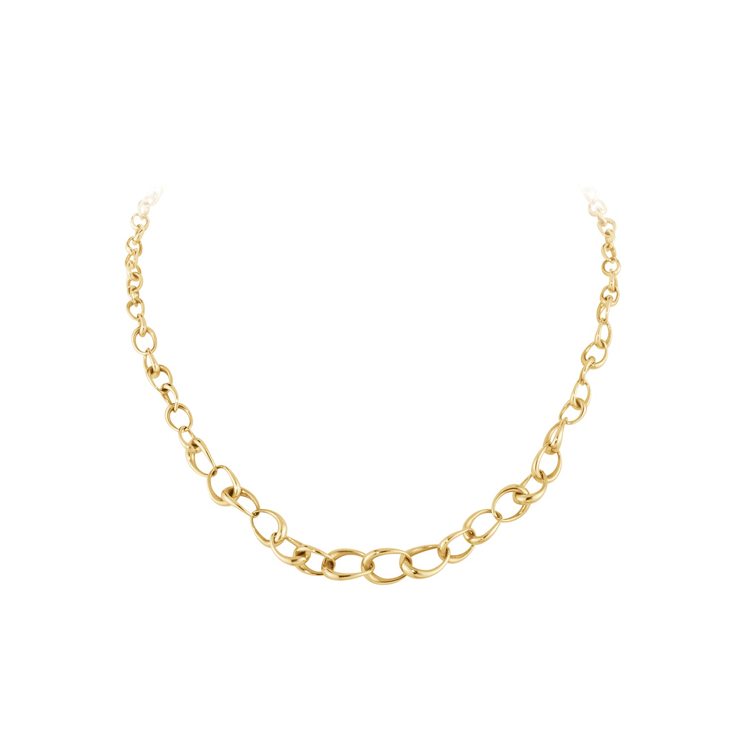 Halskæden er udført i en smuk guldfarvet nuance, der tilføjer et strejf af luksus til dit look. De graduede led skaber en harmonisk balance mellem enkelhed og kompleksitet, hvilket gør den til et iøjnefaldende smykke. Den glatte overflade og de bløde kurver giver en behagelig følelse mod huden, mens det tidløse design sikrer, at halskæden aldrig går af mode.