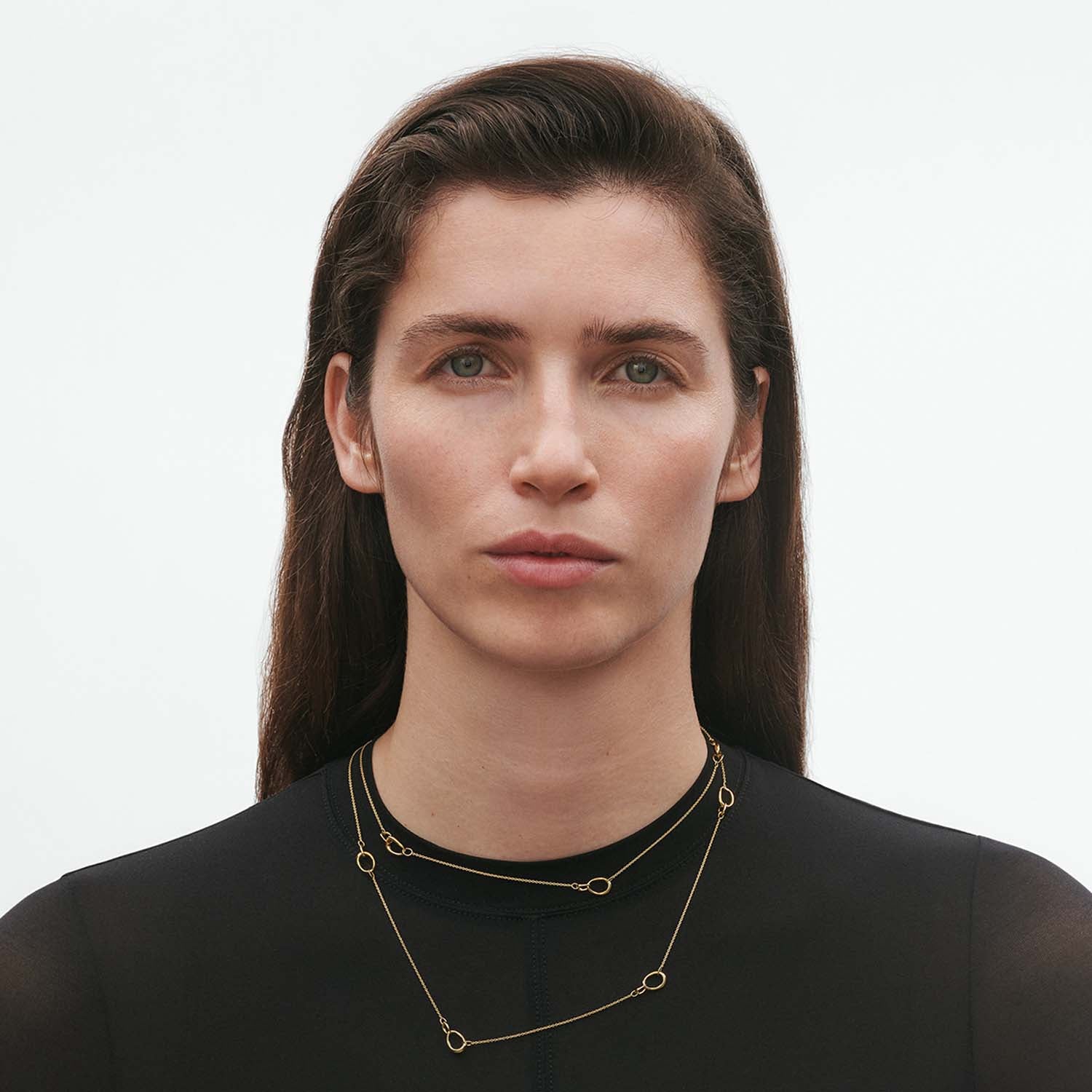 Halskæden er en del af Georg Jensens ikoniske designtradition, hvor enkelhed møder sofistikeret håndværk. De delikate ovale led skaber en smuk rytme og bevægelse, der fanger lyset på en subtil måde. Den varme gyldne farve tilføjer en blød glød til din hud, mens den glatte overflade føles behagelig mod halsen.
