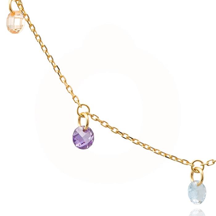 Dette collier er en fryd for øjet med sine delikate kæder og farverige zirkonia, der hænger elegant fra det forgyldte design. De små sten i nuancer af lilla, blå og orange skaber en harmonisk farvepalet, der fanger lyset smukt. Den fine kæde giver en let og luftig følelse, mens de glitrende zirkonia tilføjer et strejf af luksus. Når du bærer dette smykke, vil du opleve en følelse af elegance og stil, der komplementerer enhver påklædning.