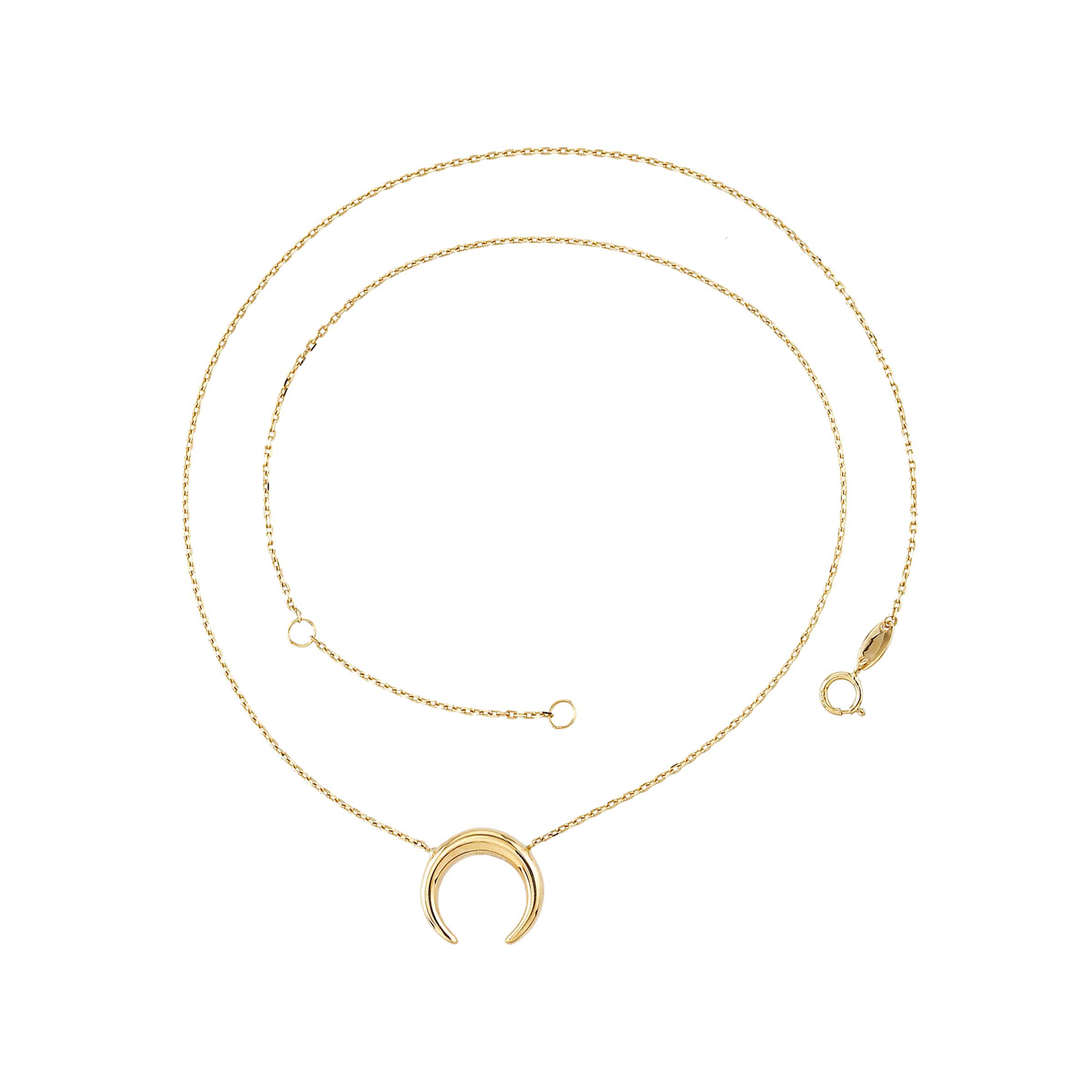 Halskæden har en smuk gylden farve, der fanger lyset på en subtil og elegant måde. Den fine kæde er let og behagelig at bære, hvilket gør den ideel til daglig brug. Hornvedhænget tilføjer et unikt og stilfuldt element, der skiller sig ud uden at være prangende.