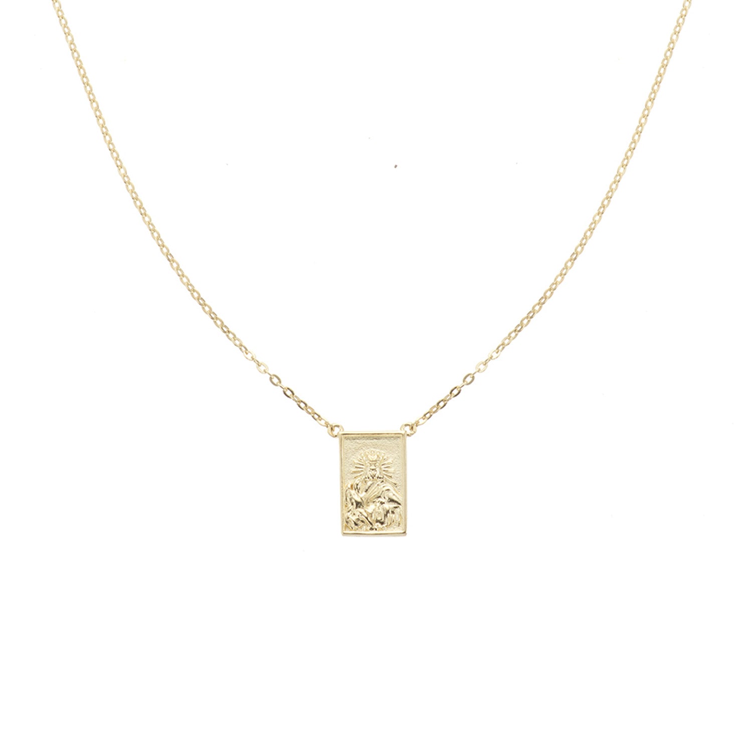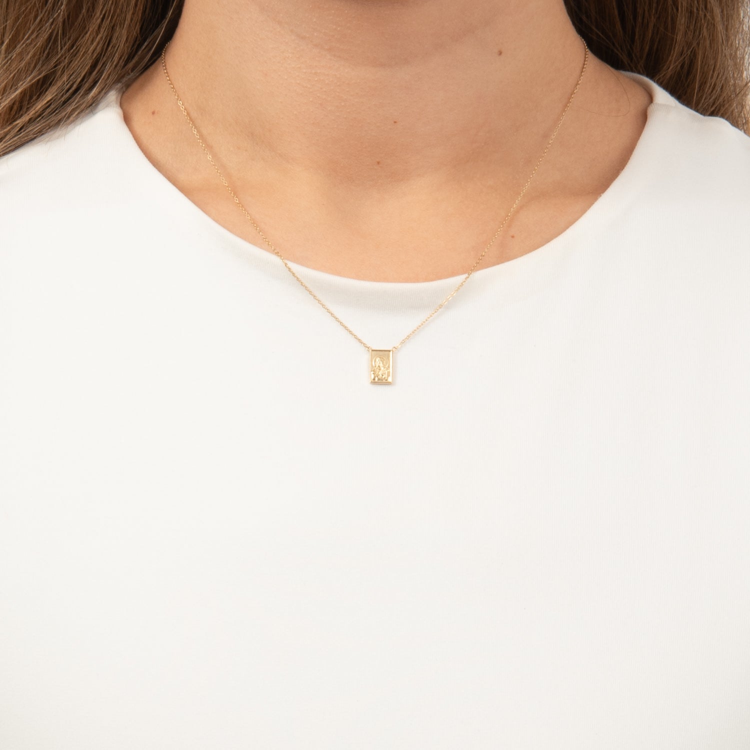 Halskæden udstråler en varm gylden glød, der fanger lyset smukt. Den fine kæde er let og behagelig at bære, mens pladens detaljerede motiv tilføjer en kunstnerisk dimension. Detaljerne på pladen er præcist udført, hvilket giver et sofistikeret udtryk, der passer til både hverdag og fest.