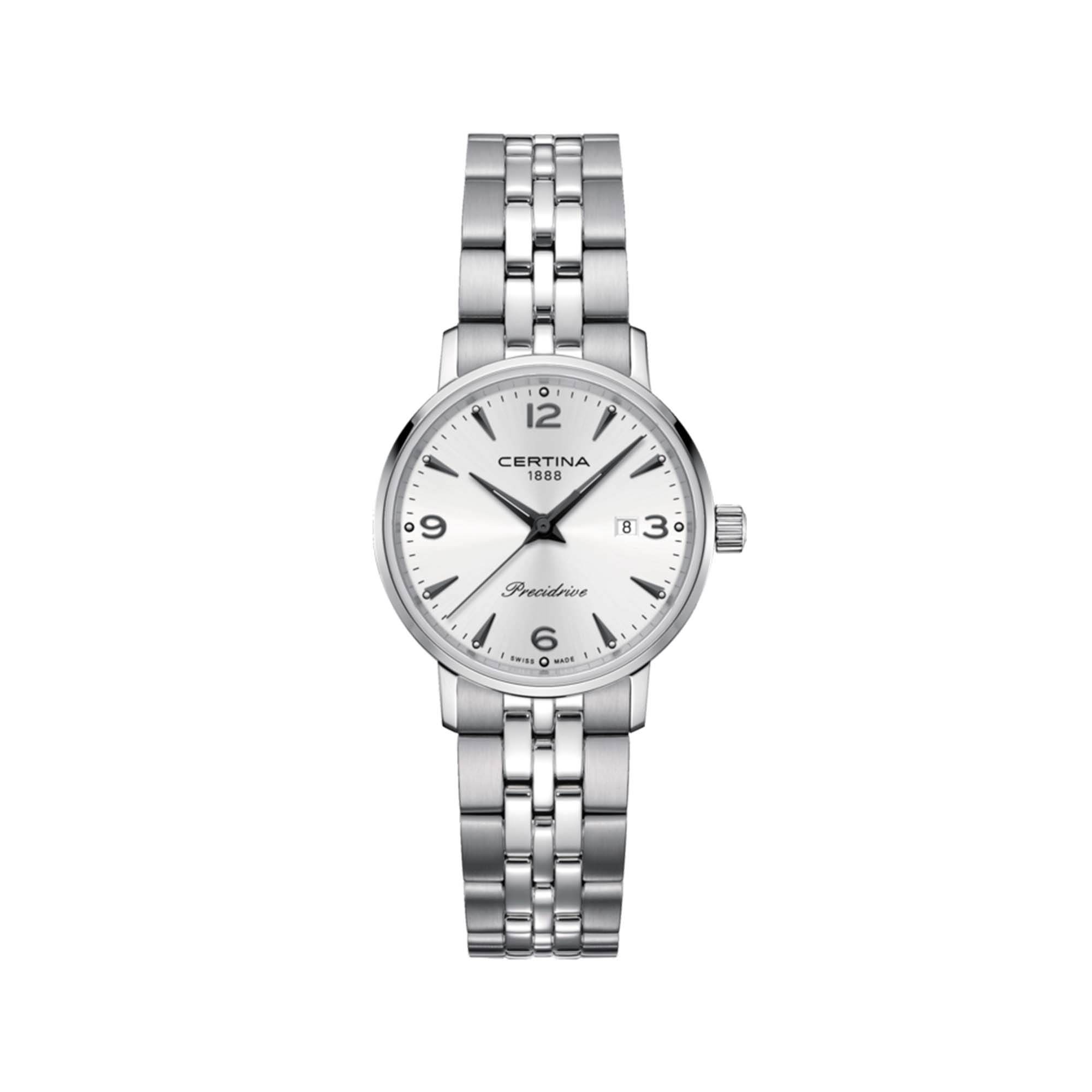 Designet af Certina Caimano dameur er en hyldest til klassisk skønhed. Urets sølvfarvede urskive står i smuk kontrast til det polerede stålarmbånd, hvilket skaber et sofistikeret look. De tydelige tal og markeringer gør det nemt at aflæse tiden, mens den diskrete datovisning tilføjer funktionalitet.