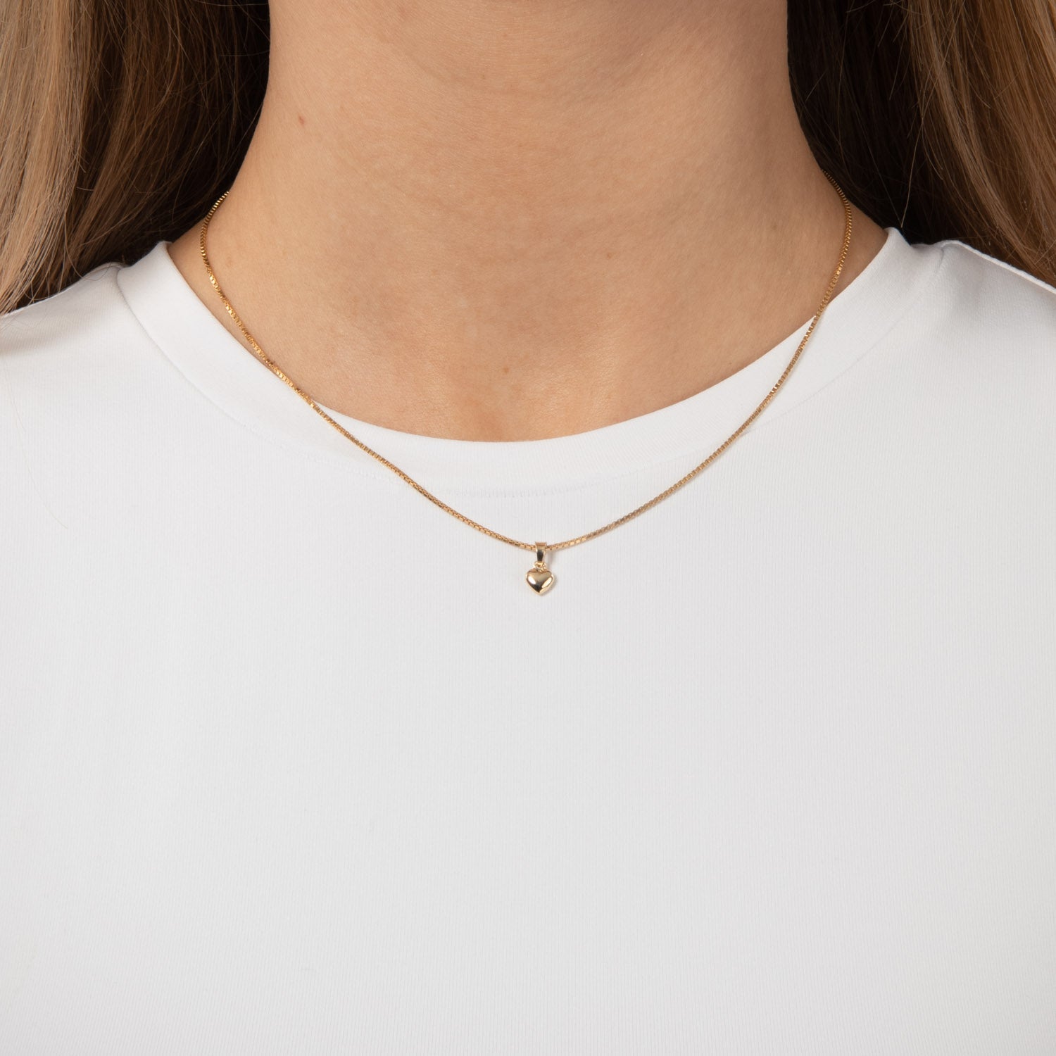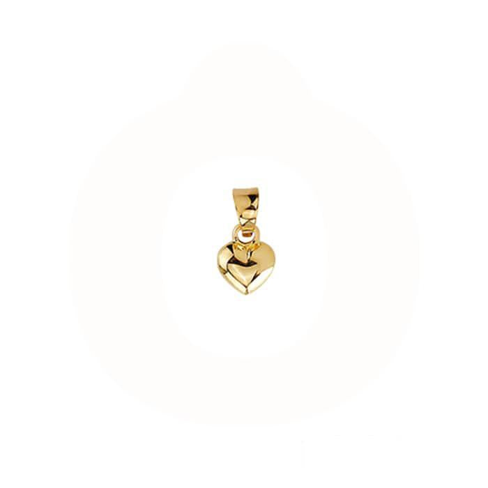 Dette smukke vedhæng er formet som et hjerte og udstråler en varm, gylden glans, der fanger lyset på en subtil og sofistikeret måde. Den glatte overflade og det enkle design gør det til et alsidigt smykke, der kan bæres alene eller sammen med andre halskæder for et lagdelt look.
