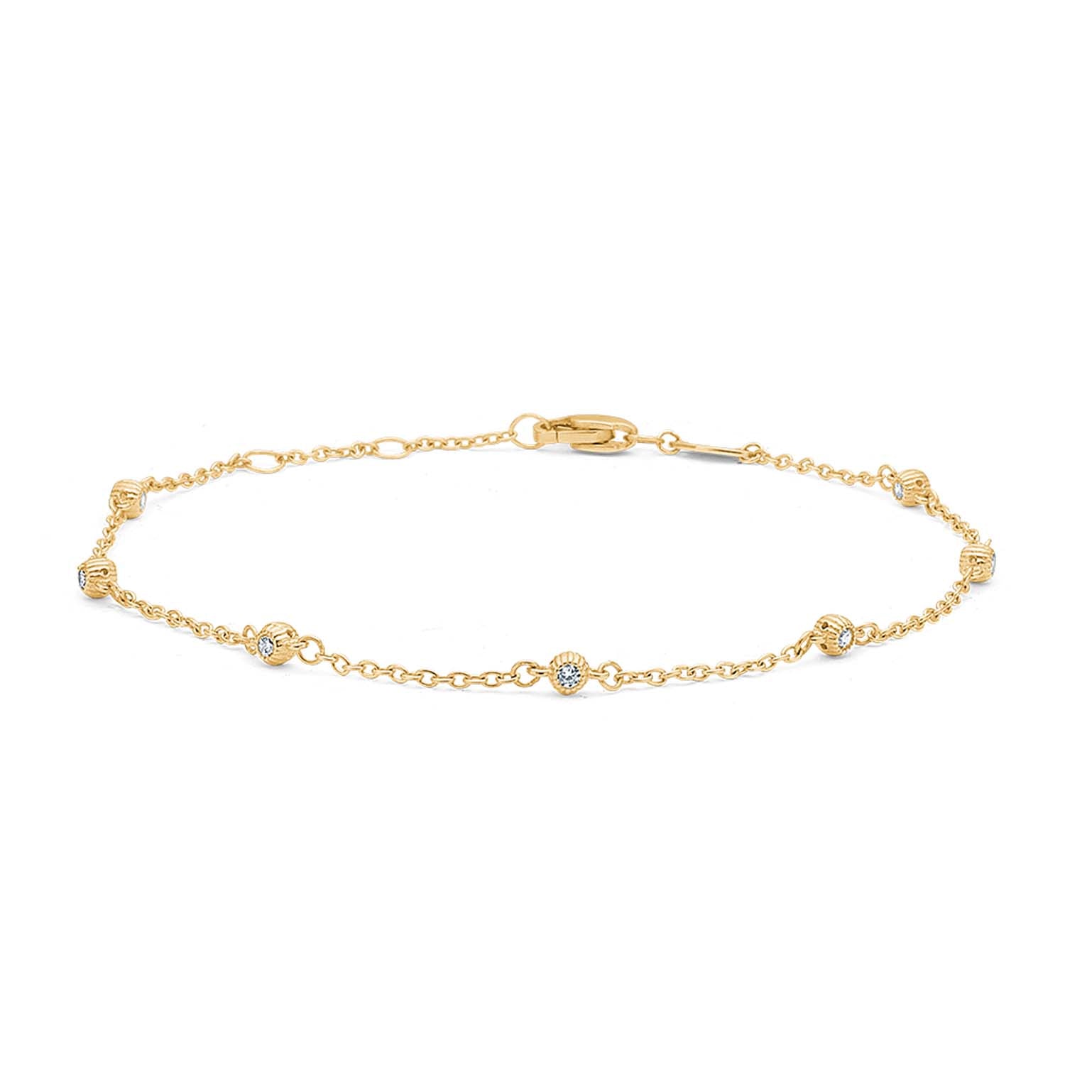 Armbåndet er udført i en smuk guldfarve, der komplementerer enhver hudtone. De delikate zirkonia-sten er strategisk placeret langs kæden, hvilket skaber en subtil, men iøjnefaldende glans. Den fine kæde er både let og behagelig at bære, hvilket gør det til det perfekte tilbehør til daglig brug.