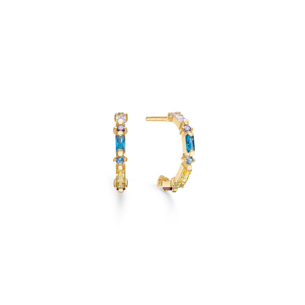 Øreringene er udsmykket med en række farverige sten, der skaber et levende og iøjnefaldende udtryk. Den gyldne ramme fremhæver de klare blå, lilla og gule nuancer, hvilket giver et sofistikeret og stilfuldt look. Hver sten er omhyggeligt indfattet for at sikre holdbarhed og glans.