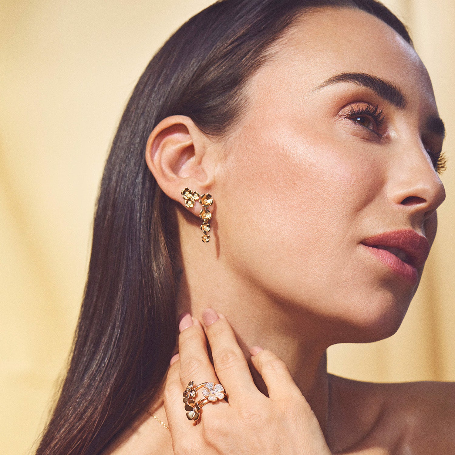 Disse ørestikker er inspireret af naturens skønhed, hvilket ses i de delikate blomsterdesigns. Den gyldne farve skaber en varm og indbydende glød, mens de små diamanter i midten af hver blomst fanger lyset på en betagende måde. Ørestikkerne er både lette og behagelige at bære, hvilket gør dem ideelle til daglig brug.