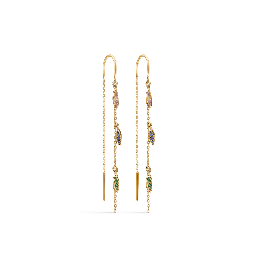 Disse ørehængere er en fryd for øjet med deres gyldne kæder og farverige sten, der glimter i lyset. De fine kæder hænger yndefuldt og skaber en smuk bevægelse, når du bærer dem. De små, indlagte sten i forskellige nuancer tilføjer et strejf af farve og liv til designet, hvilket gør dem perfekte til at fremhæve din personlige stil.