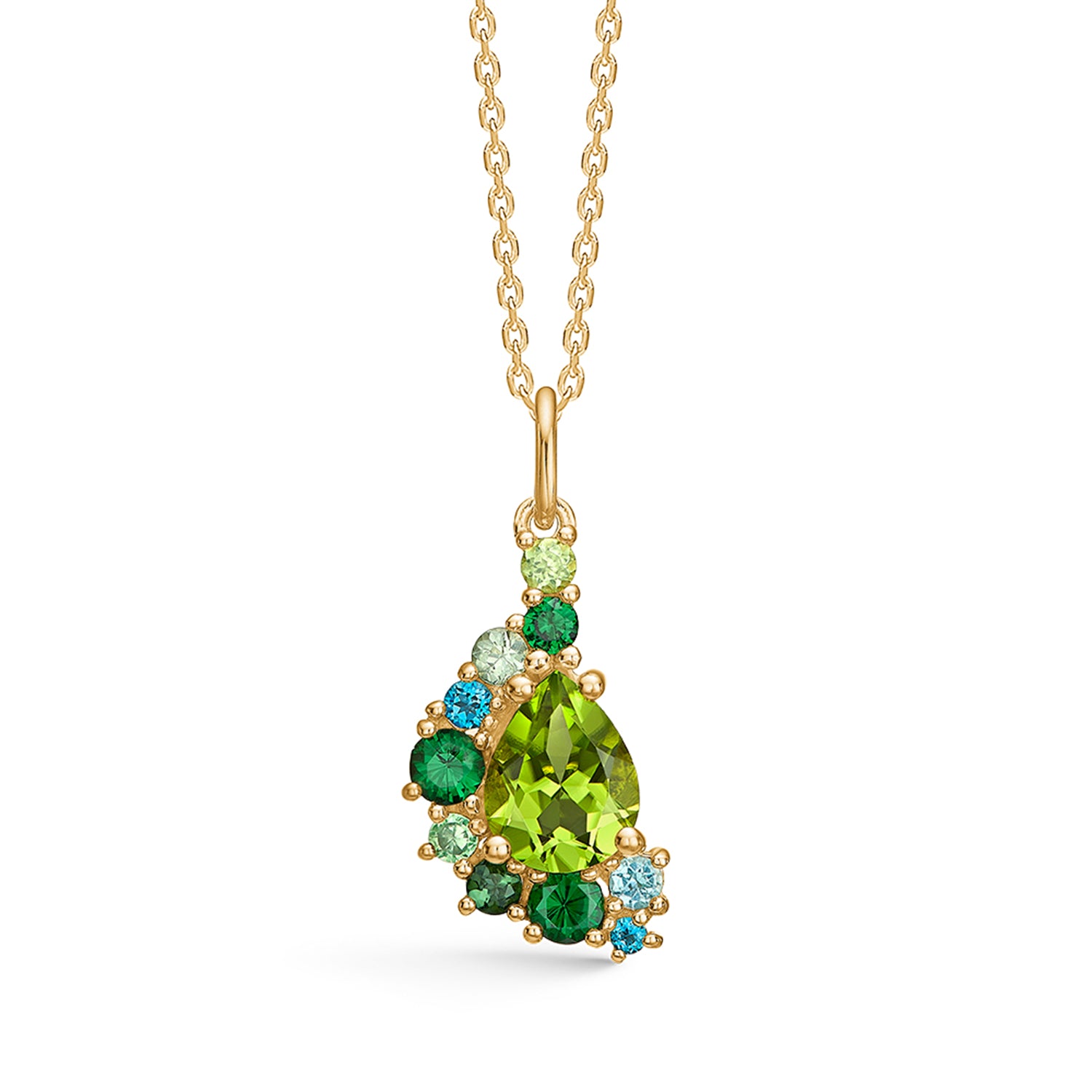 Vedhænget præsenterer en harmonisk blanding af grønne og blå nuancer, der minder om naturens forfriskende palet. De små, glitrende sten er omhyggeligt indfattet og skaber en smuk kontrast til det varme guld. Den dråbeformede peridot i midten tiltrækker øjet med sin klare, grønne glans, mens de omkringliggende sten i forskellige nuancer af blå og grøn tilføjer dybde og dimension.