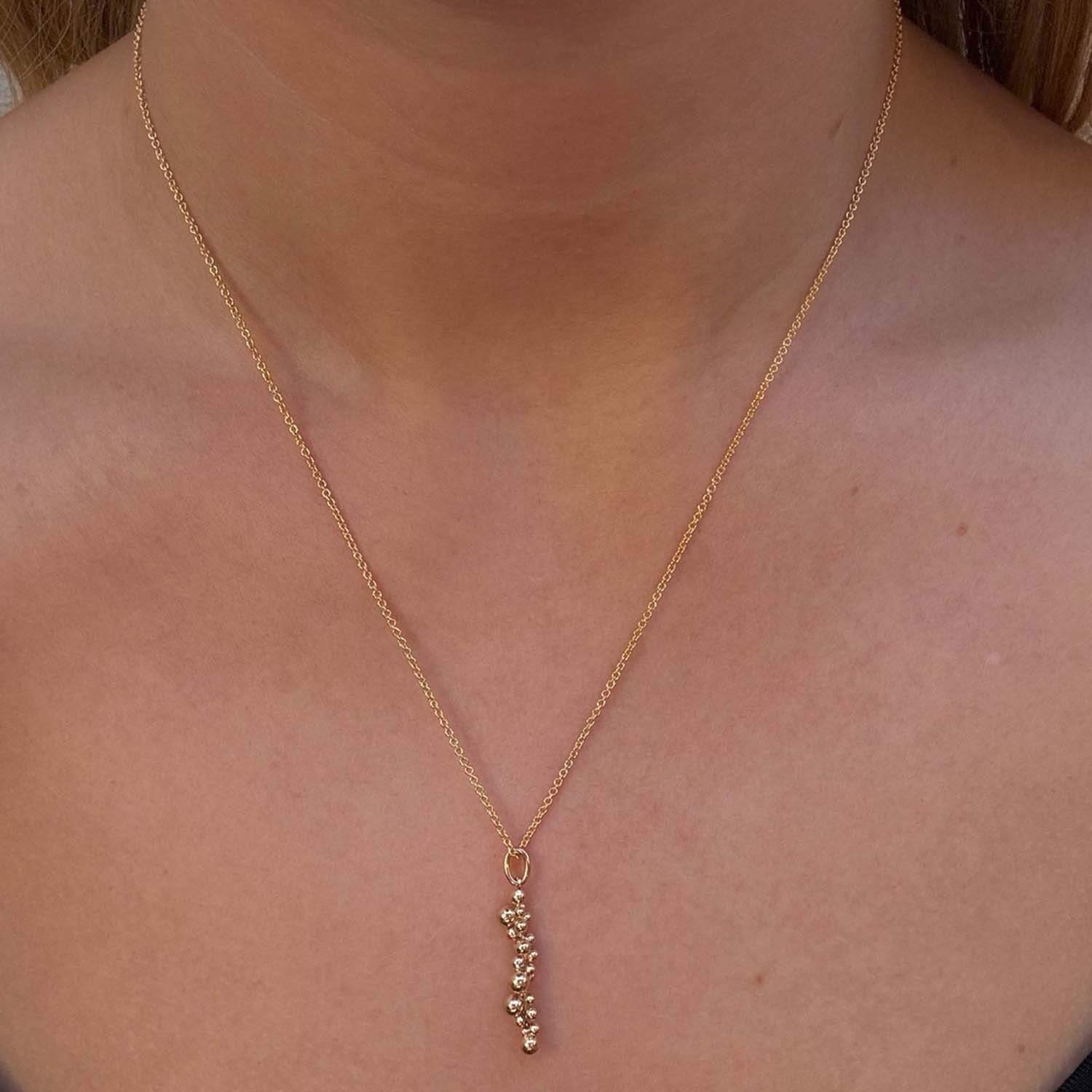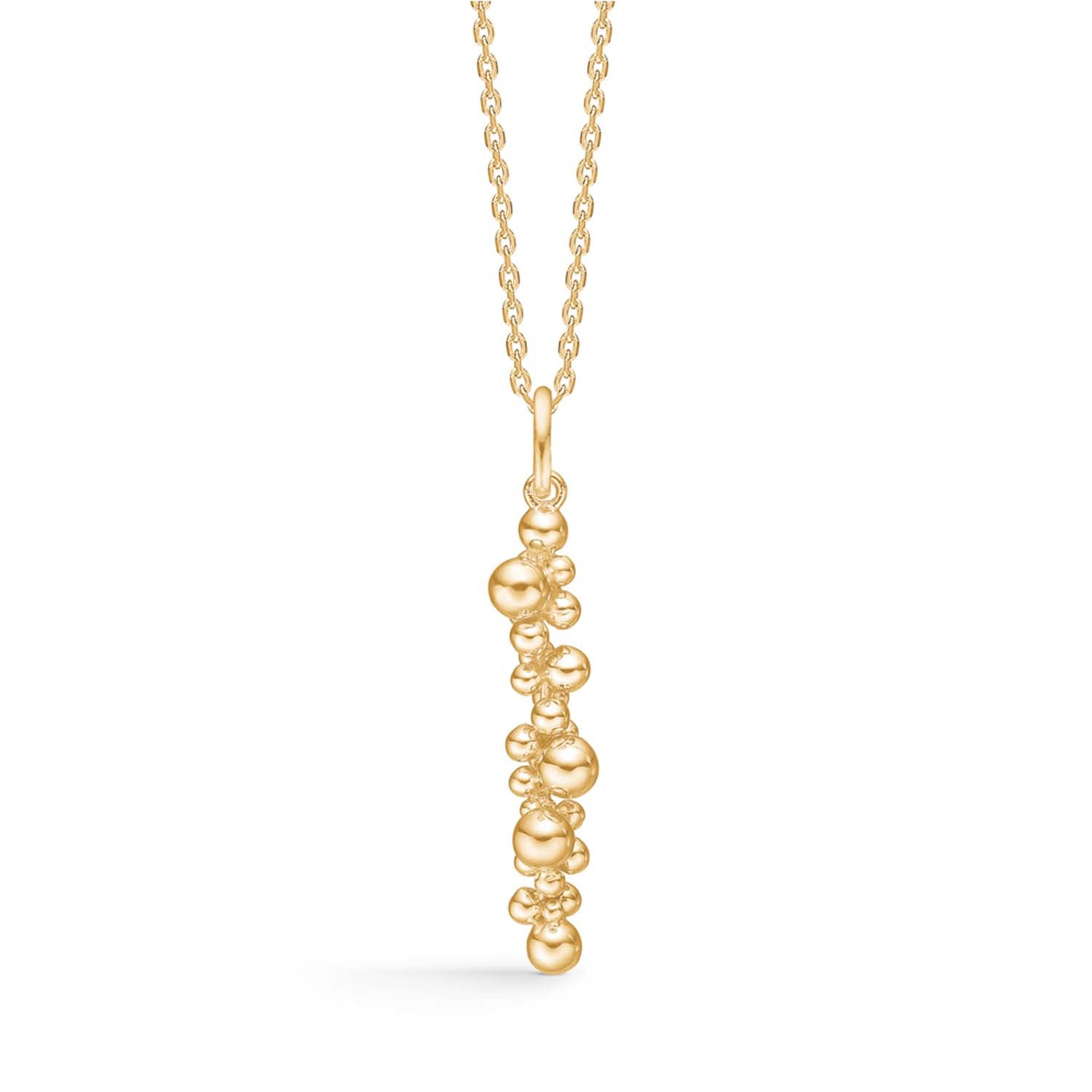 Vedhænget er udført i en varm guldfarve, der udstråler elegance og varme. De små kugler, der udgør vedhænget, giver en unik tekstur, som tilføjer dybde og karakter. Når du bærer dette vedhæng, vil du opleve, hvordan dets lette vægt og glatte overflade føles behagelig mod huden.