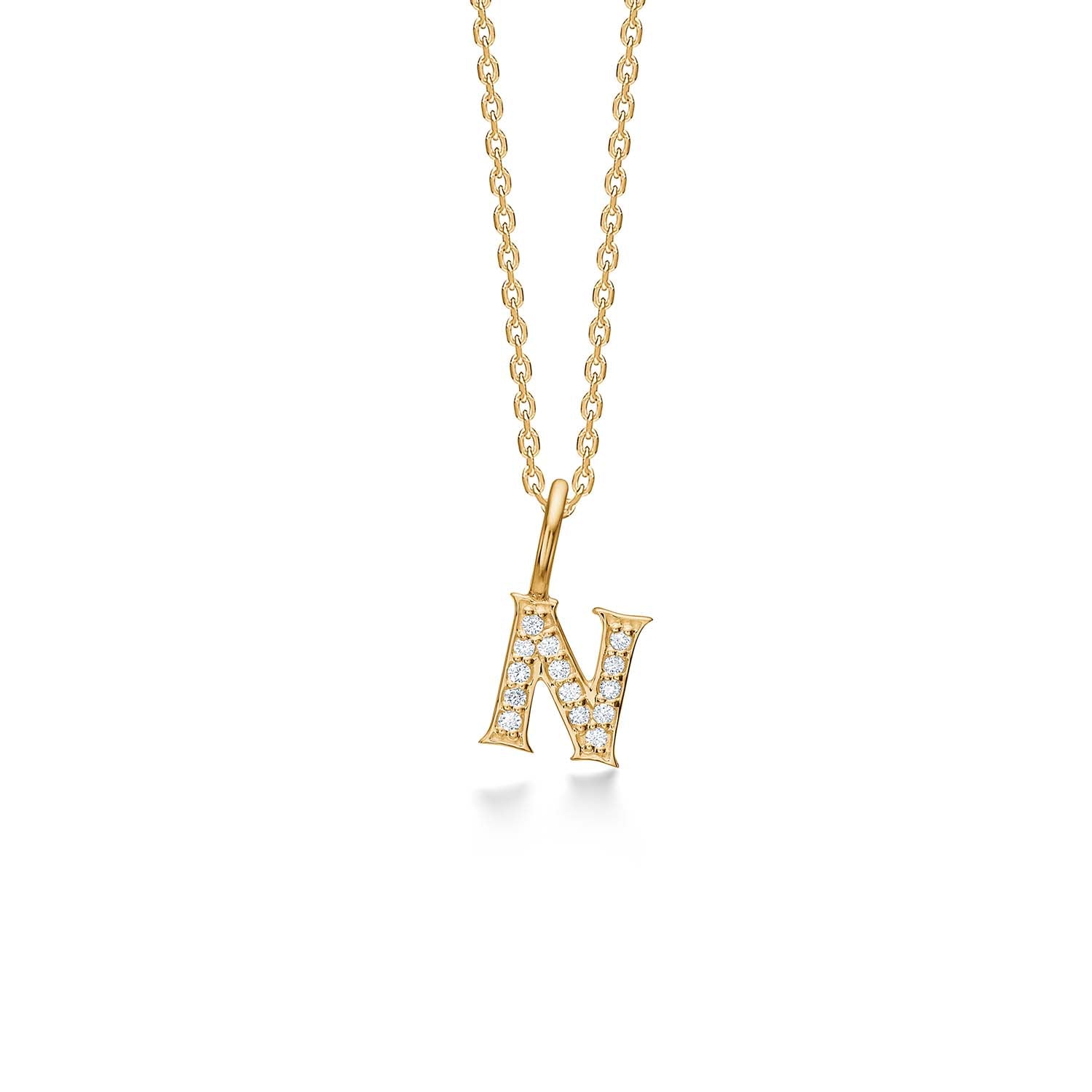 Dette vedhæng er en udsøgt kombination af gyldent skær og funklende diamanter. Den varme glød fra det 14 kt. guld fremhæver de klare diamanter, der er omhyggeligt indfattet for at skabe et elegant udtryk. Bogstavet "N" er designet med præcision, hvilket giver det en raffineret og moderne æstetik.