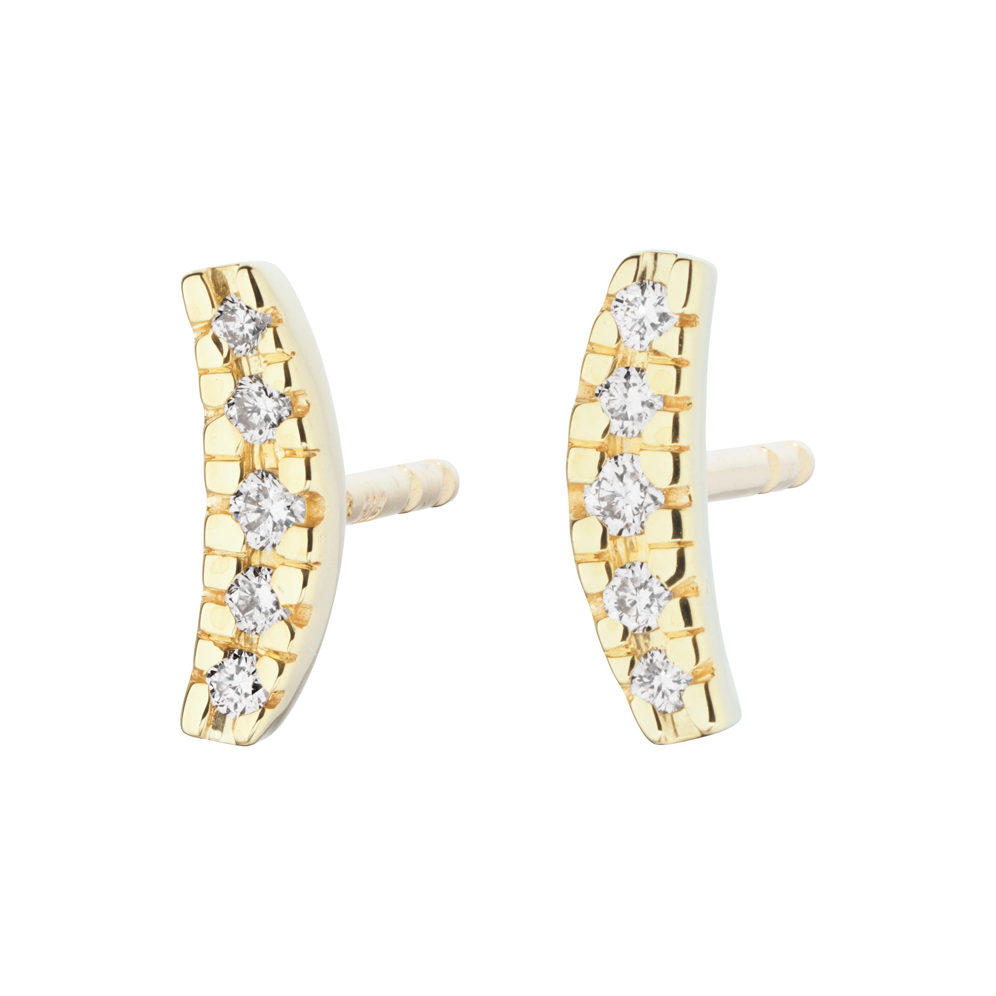 Ørestikkernes design er både klassisk og moderne, med en række funklende diamanter, der er omhyggeligt indfattet i det gyldne metal. Den buede form tilføjer en unik dimension, der fanger lyset fra alle vinkler. Den glatte overflade og den varme gyldne farve skaber en harmonisk balance mellem elegance og enkelhed.