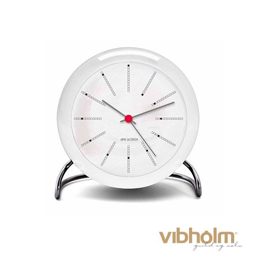 Dette bordur er et mesterværk af design, der afspejler Arne Jacobsens unikke stil. Urets rene hvide skive er omkranset af en skinnende, kromfarvet ramme, der tilføjer et strejf af luksus. De slanke, sorte visere og de diskrete markeringer giver en klar og præcis tidsvisning.