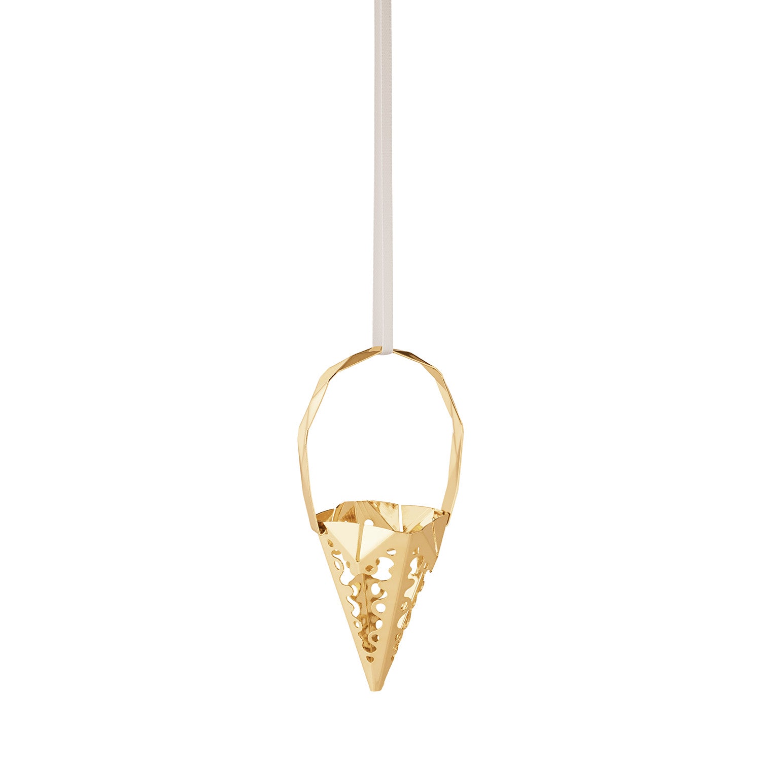 Det guldbelagte kræmmerhus har en smuk, skinnende overflade, der fanger lyset på en betagende måde. Den røde snor til ophængning skaber en klassisk kontrast til det gyldne metal, hvilket gør ornamentet til et iøjnefaldende element på ethvert juletræ. De delikate udskæringer i metallet tilføjer en ekstra dimension af elegance og håndværk, som Georg Jensen er kendt for.