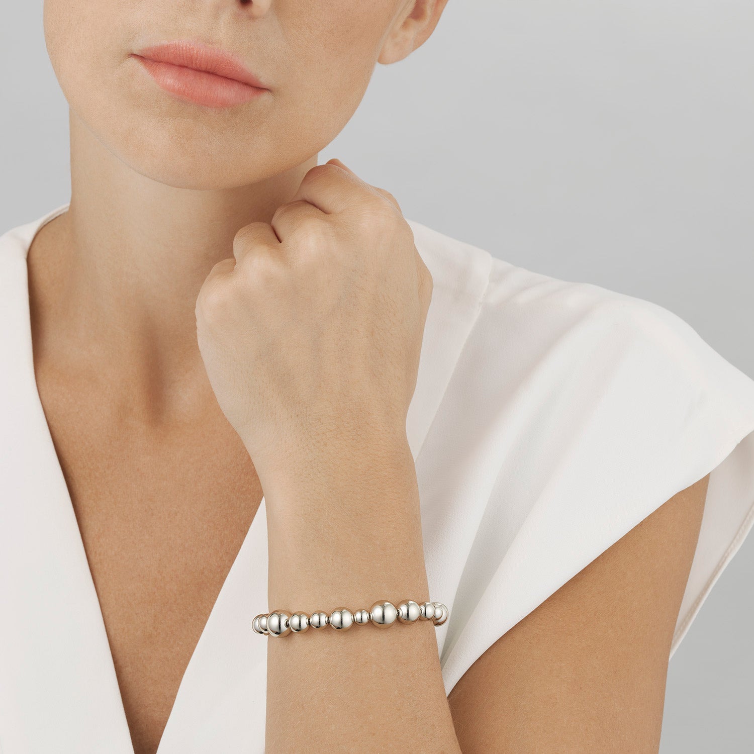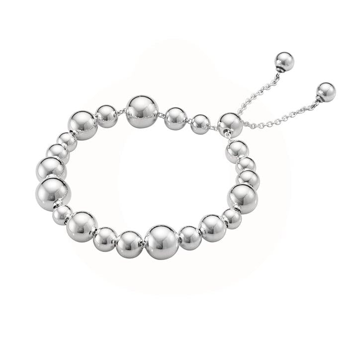 Armbåndet er en visuel fornøjelse med sine glatte, polerede kugler, der minder om druer i måneskin. Den sølvfarvede overflade reflekterer lyset smukt og tilføjer et strejf af luksus til dit håndled. Designet er både moderne og klassisk, hvilket gør det til et alsidigt valg for enhver garderobe.