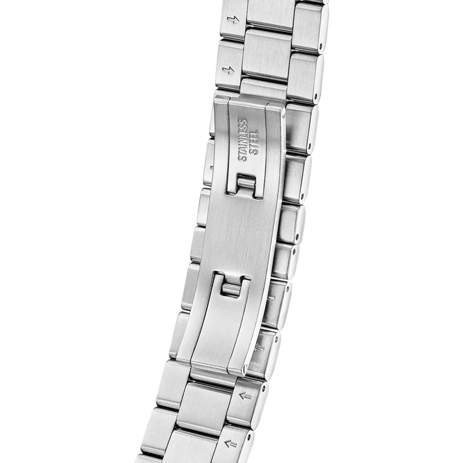 Uret præsenterer en sofistikeret blå urskive, der står i smuk kontrast til den polerede stållænke. De sølvfarvede markører og visere tilføjer et strejf af luksus, mens datovisningen giver praktisk funktionalitet. Safirglasset beskytter mod ridser, hvilket sikrer, at uret forbliver fejlfrit.