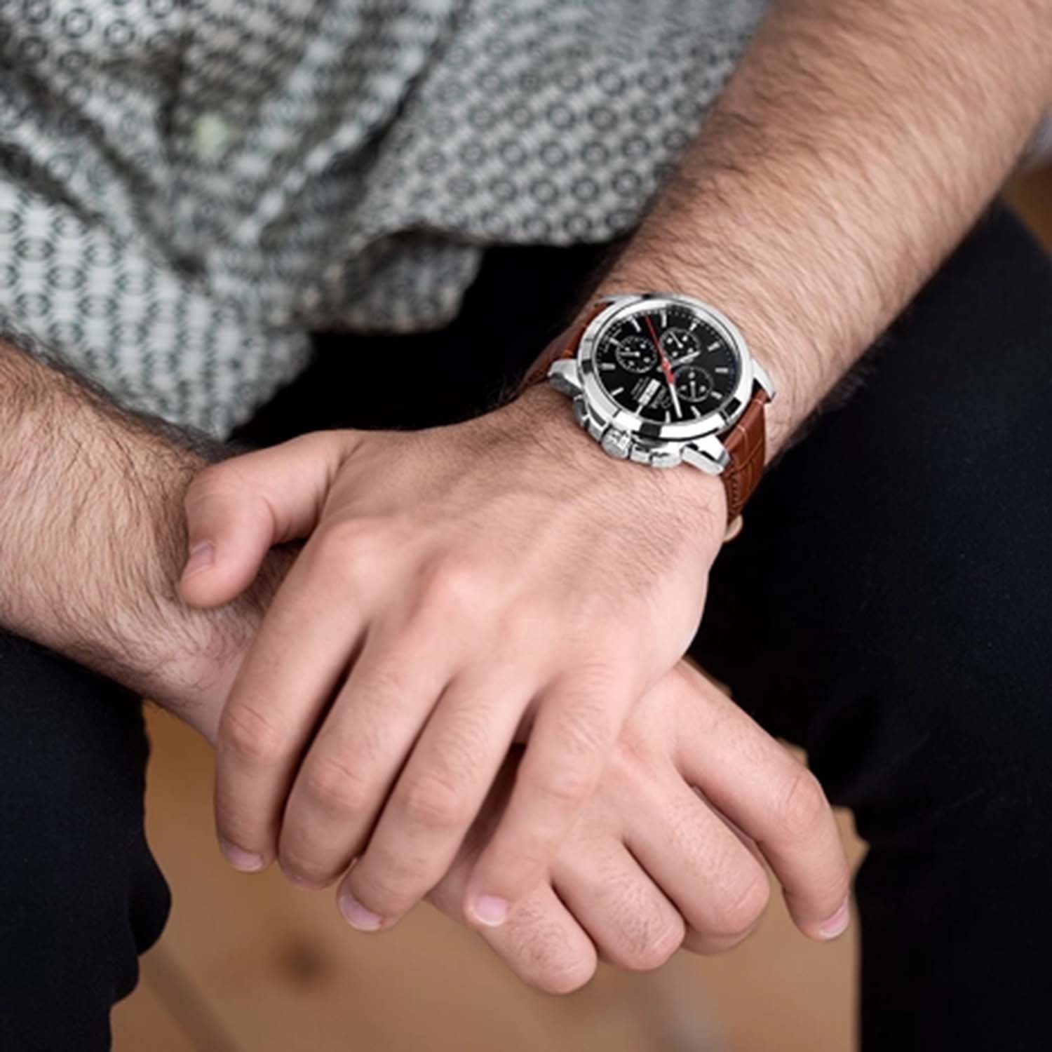 Urets design er en fryd for øjet. Den sorte urskive med kontrasterende hvide markeringer giver et sofistikeret look, mens den brune læderrem tilføjer en varm og klassisk følelse. De tre subdials og datovisning giver både funktionalitet og et dynamisk udtryk. Den robuste stålramme sikrer holdbarhed og en luksuriøs finish.