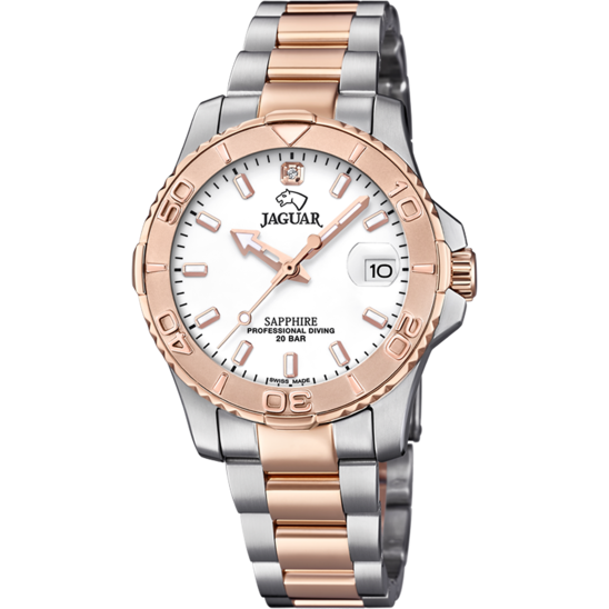 Designet af Jaguar Lady Diver dameuret er en fryd for øjet. Den skinnende urskive i hvid står i smuk kontrast til den forgyldte urkrans og de detaljerede timeindikatorer. Urets tofarvede armbånd i rustfrit stål og rosaguld giver en luksuriøs følelse, der både er robust og stilfuld. Med en diameter, der passer perfekt til håndleddet, føles uret både let og komfortabelt i brug.