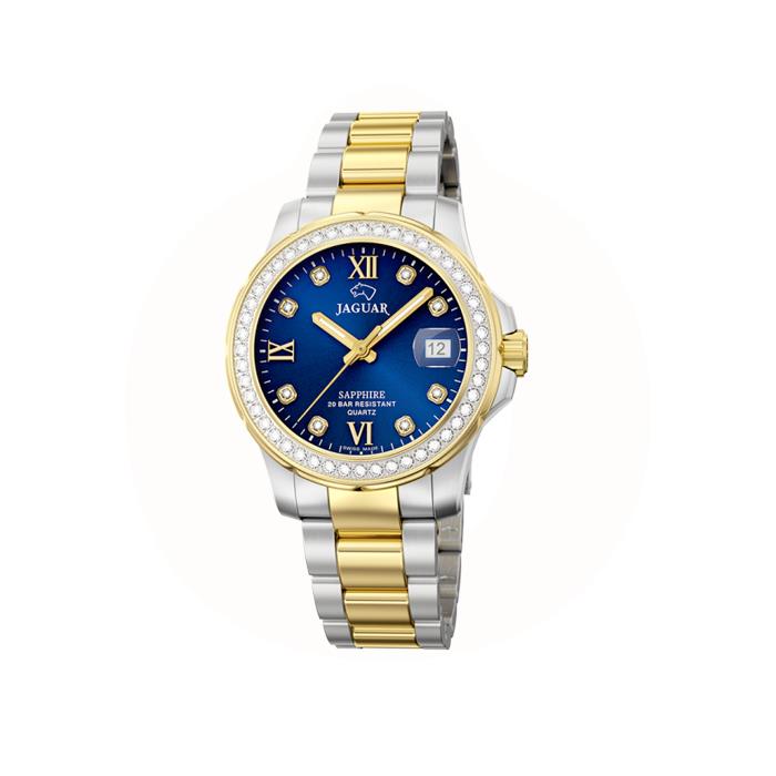 Designet af Jaguar Lady Diver dameuret er en fryd for øjet. Med en dybblå urskive, der fremhæves af funklende stenmarkeringer, udstråler det både stil og raffinement. Den forgyldte urkrans og tofarvede lænke i rustfrit stål giver en luksuriøs følelse, mens de romerske tal tilføjer et klassisk touch. Uret føles solidt og komfortabelt på håndleddet, hvilket gør det til en fornøjelse at bære hele dagen.