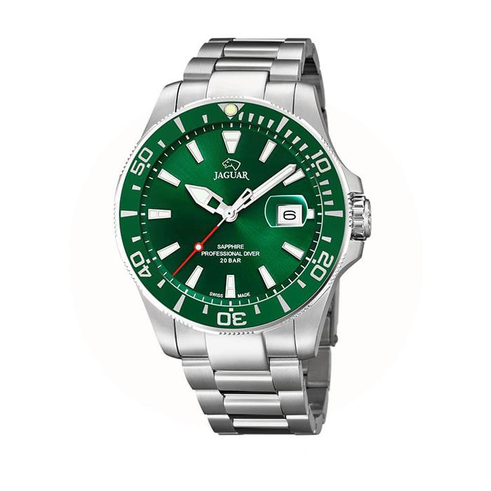 Oplev en verden af præcision og stil med Jaguar Professional Diver Herreur. Dette ur er designet til den moderne mand, der værdsætter både funktionalitet og æstetik.