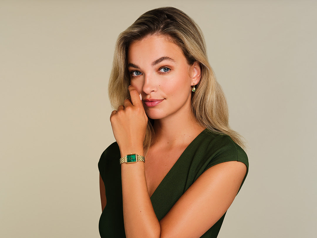 Dette ur er en fryd for øjet med sin unikke ottekantede urskive i en dyb grøn farve, der fanger lyset på smukkeste vis. Den forgyldte lænke tilføjer et strejf af luksus og komfort, der gør det behageligt at bære hele dagen. Den præcise kvartsbevægelse sikrer, at du altid er punktlig, mens safirglasset beskytter mod hverdagens slid.