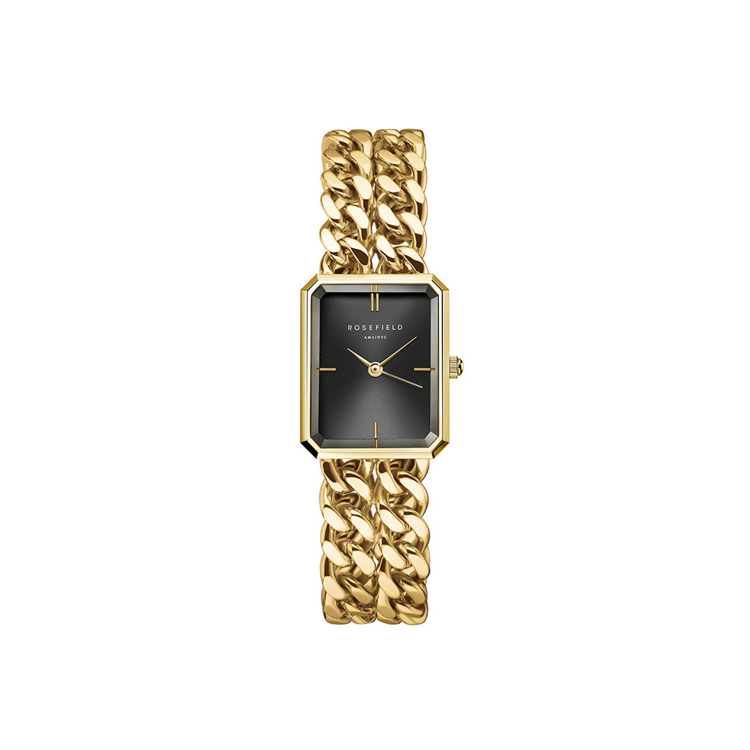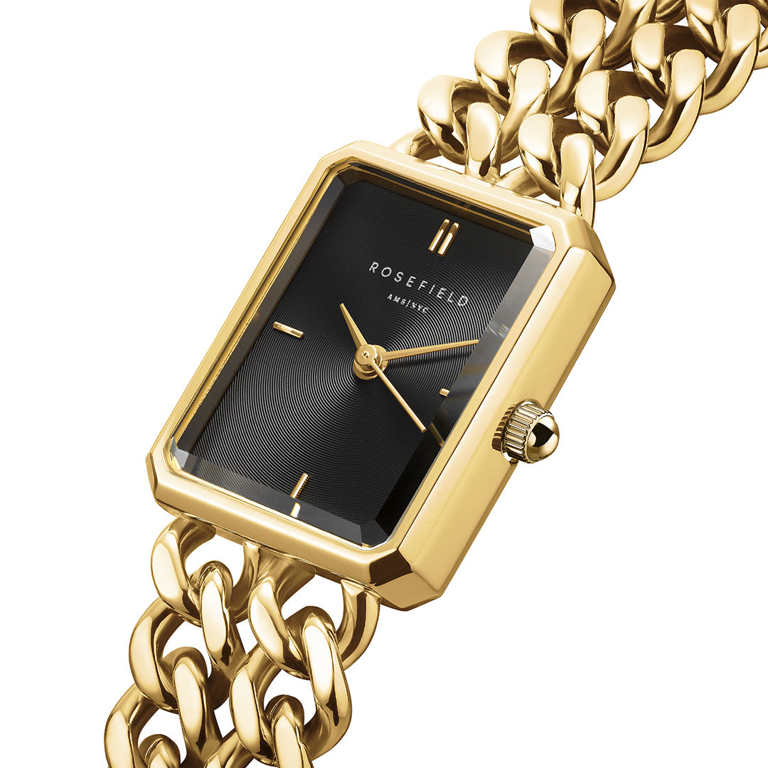 Det vedhæftede billede viser urets sofistikerede sorte urskive, der skaber en smuk kontrast til den gyldne lænke. Den rektangulære form giver et moderne udtryk, mens den polerede overflade reflekterer lyset på en elegant måde. Den robuste lænke i rustfrit stål føles behagelig mod huden og sikrer en sikker pasform.
