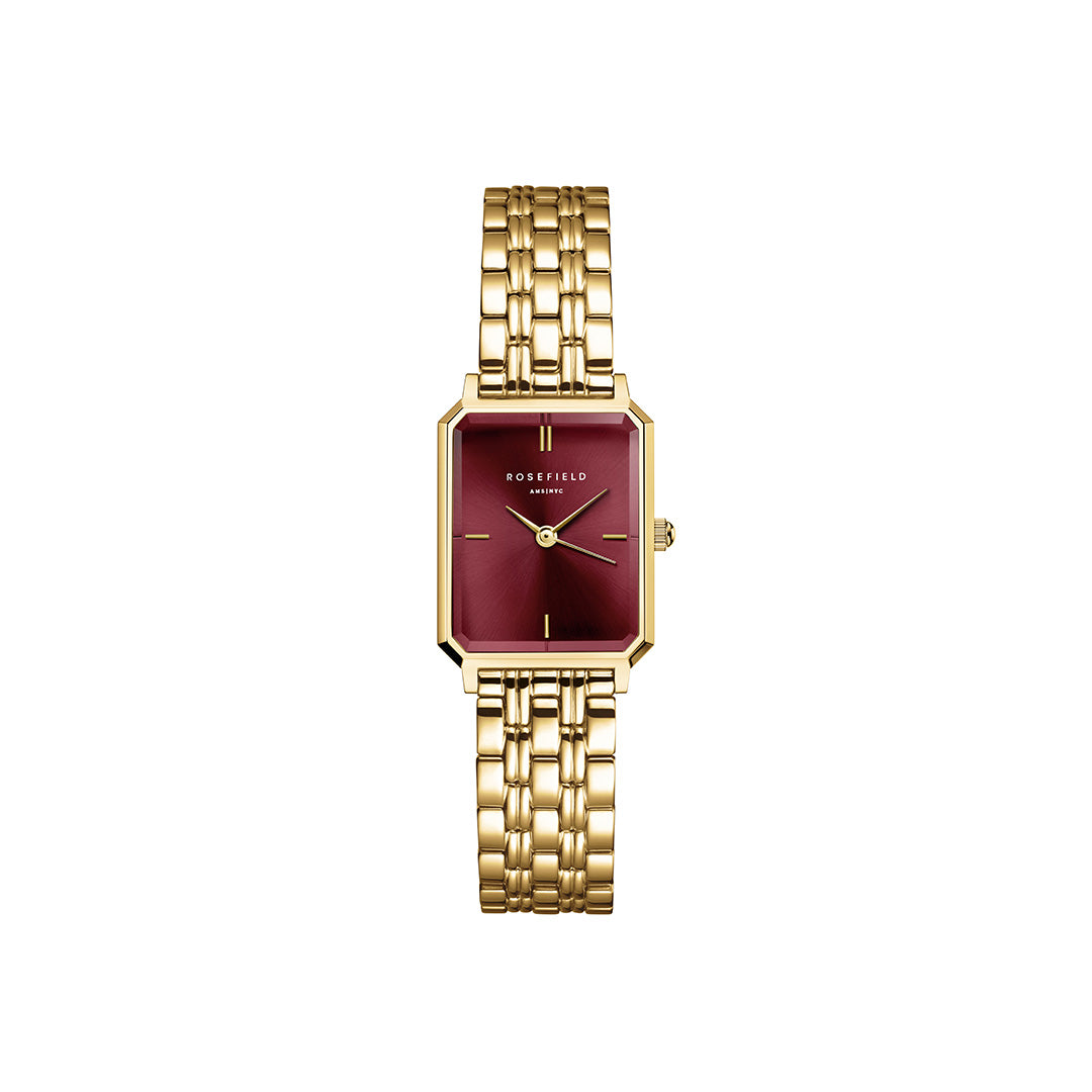 Uret er udført i en smuk guldfarvet finish, der komplementerer den dybe røde urskive. Den ottekantede form giver et unikt og sofistikeret udtryk, mens den fine lænke tilføjer et strejf af luksus. Den glatte overflade og de præcise linjer gør det til en fryd at bære.