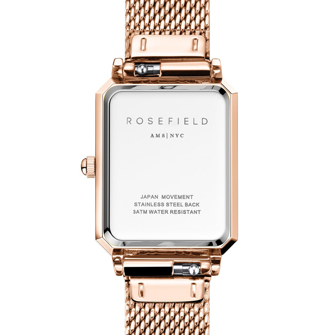 Urets rektangulære form og rosegold finish giver det et sofistikeret udtryk. Den hvide urskive skaber en smuk kontrast til den varme metalliske farve. Det rustfrie stål sikrer holdbarhed og en luksuriøs følelse på håndleddet. Den fine mesh-rem tilføjer en ekstra dimension af elegance og komfort.