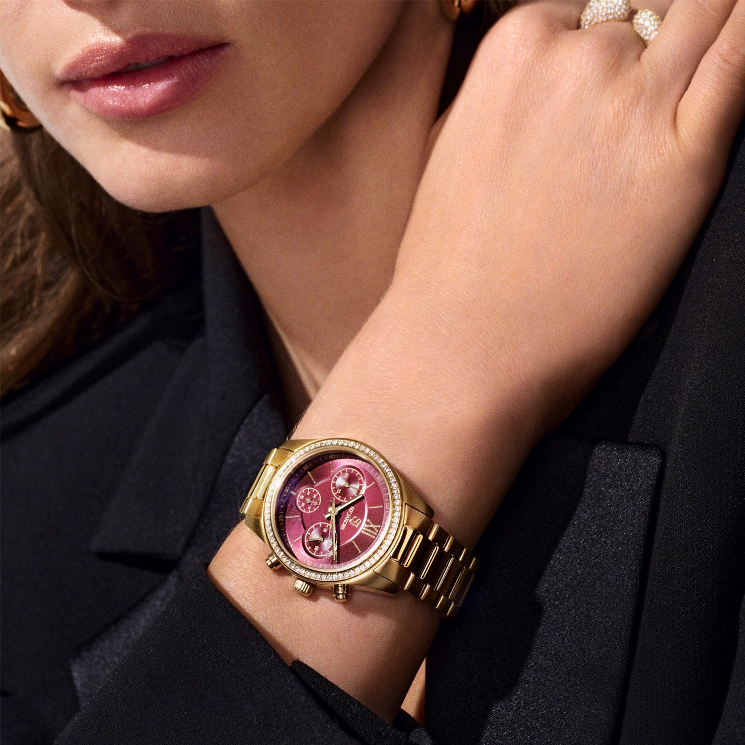 Urets forgyldte stållænke giver en glat og behagelig følelse mod huden, mens den bordeaux skive skaber en smuk kontrast, der fanger øjet. De indlagte zirkonia-sten omkring skiven tilføjer en subtil glans, der gør uret til et perfekt valg til både hverdag og festlige lejligheder.