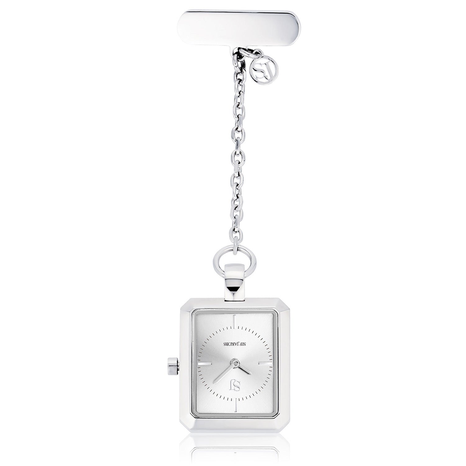 Uret er udført i en skinnende stålfinish, der giver det et moderne og professionelt udseende. Den rektangulære urskive er enkel og stilren med en sølvfarvet baggrund, der gør det nemt at aflæse tiden. Den diskrete kæde og sikkerhedsnål sikrer, at uret sidder sikkert på din uniform, mens det lille vedhæng tilføjer en subtil detalje.