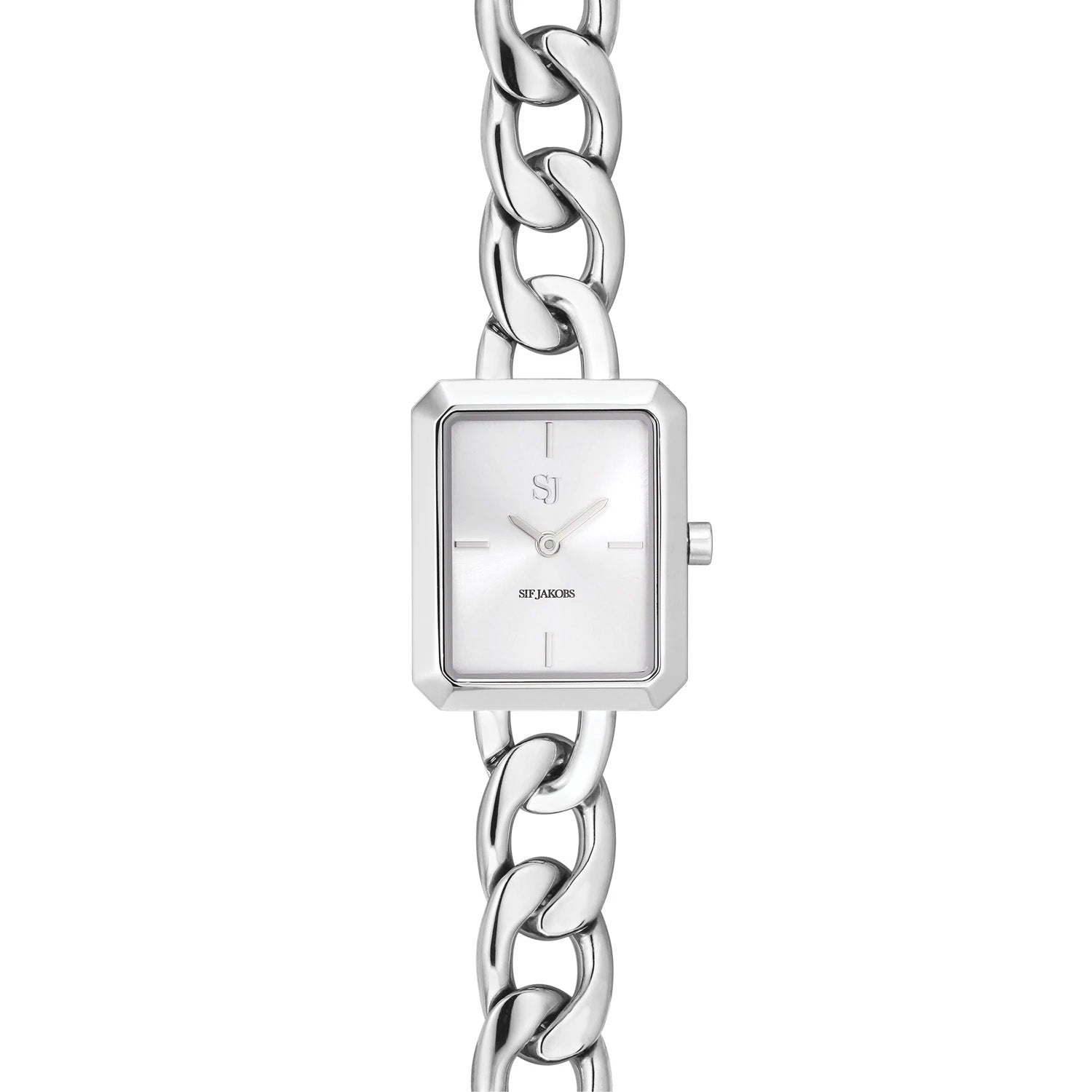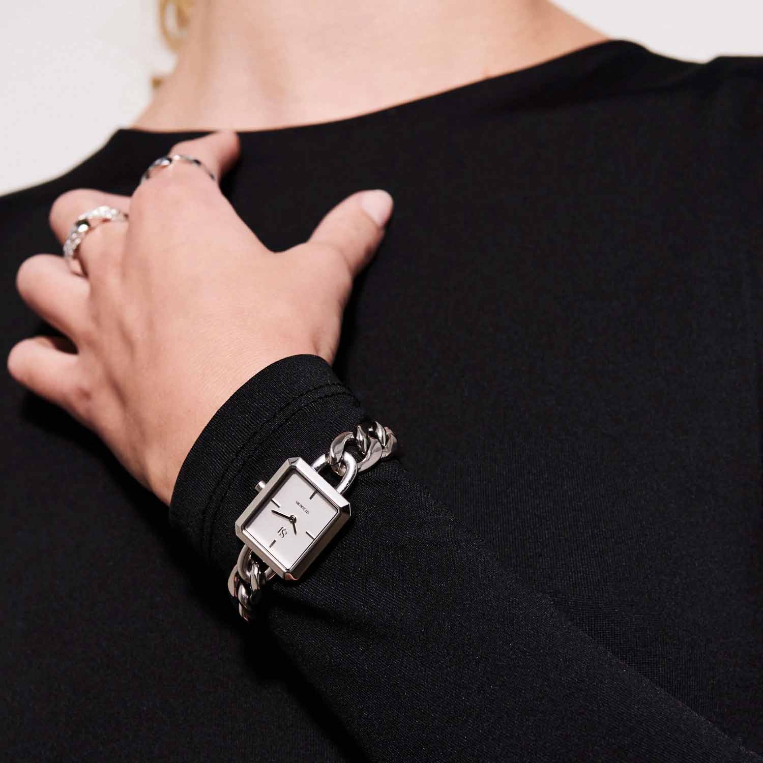 Urets firkantede urskive og polerede kædearmbånd i sølvfarvet stål skaber et sofistikeret look. Den minimalistiske urskive med diskrete markeringer fremhæver urets rene linjer og moderne æstetik. Den glatte overflade og den skinnende finish giver en luksuriøs følelse, der tiltrækker opmærksomhed uden at være prangende.