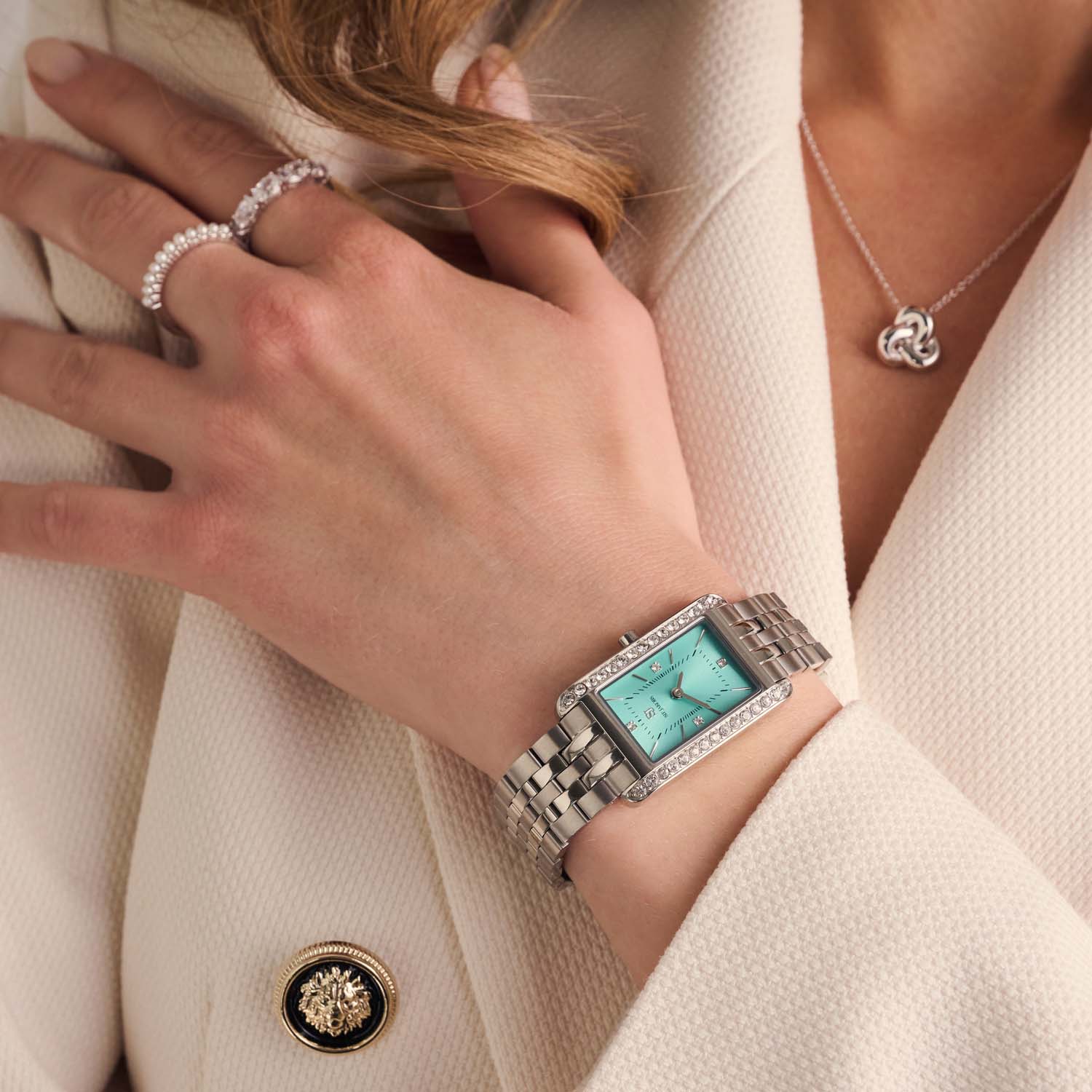 Urets rektangulære form og skinnende stållænke giver det et sofistikeret udtryk. Den turkise urskive er indrammet af funklende sten, der tilføjer en luksuriøs glans. Detaljerne på urskiven er præcise og stilfulde, hvilket gør det nemt at aflæse tiden. Når du bærer dette ur, vil du opleve en følelse af elegance og selvtillid.