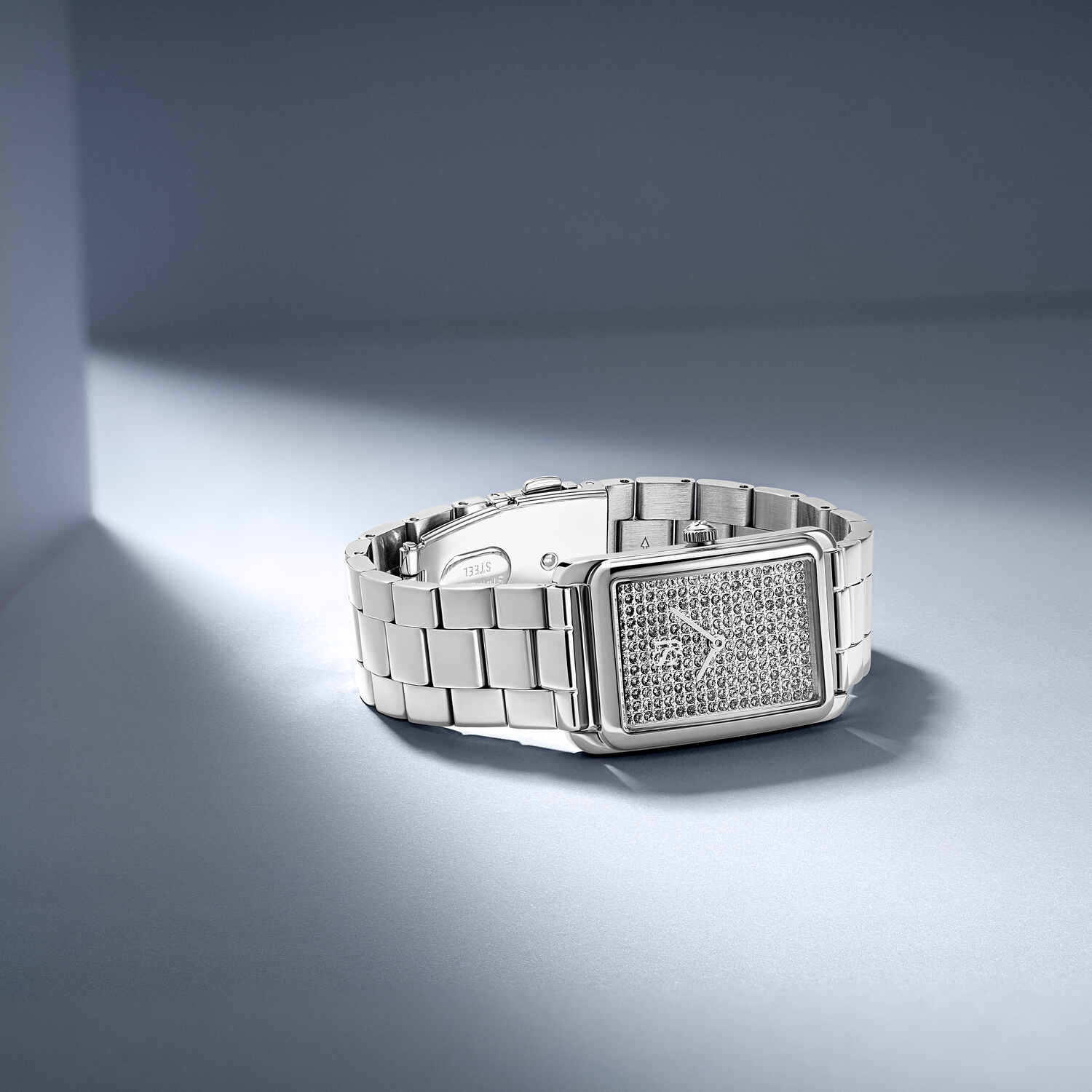 Urets design er en fryd for øjet med sin skinnende stålfinish og de mange zirkonia, der pryder urskiven. Den rektangulære form giver et moderne twist til det klassiske urdesign. Hver detalje er omhyggeligt udformet for at skabe en følelse af luksus og raffinement.