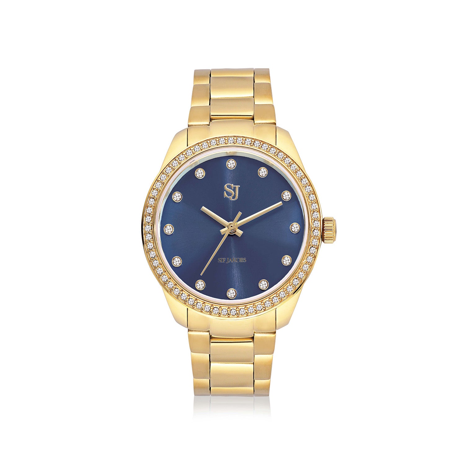 Uret er udført i en smuk guld PVD, der giver det en strålende glans. Den dybe blå urskive skaber en elegant kontrast til de gyldne detaljer, hvilket gør det til et iøjnefaldende tilbehør. De funklende sten omkring urskiven tilføjer et strejf af glamour, mens den robuste lænke sikrer komfort og holdbarhed.