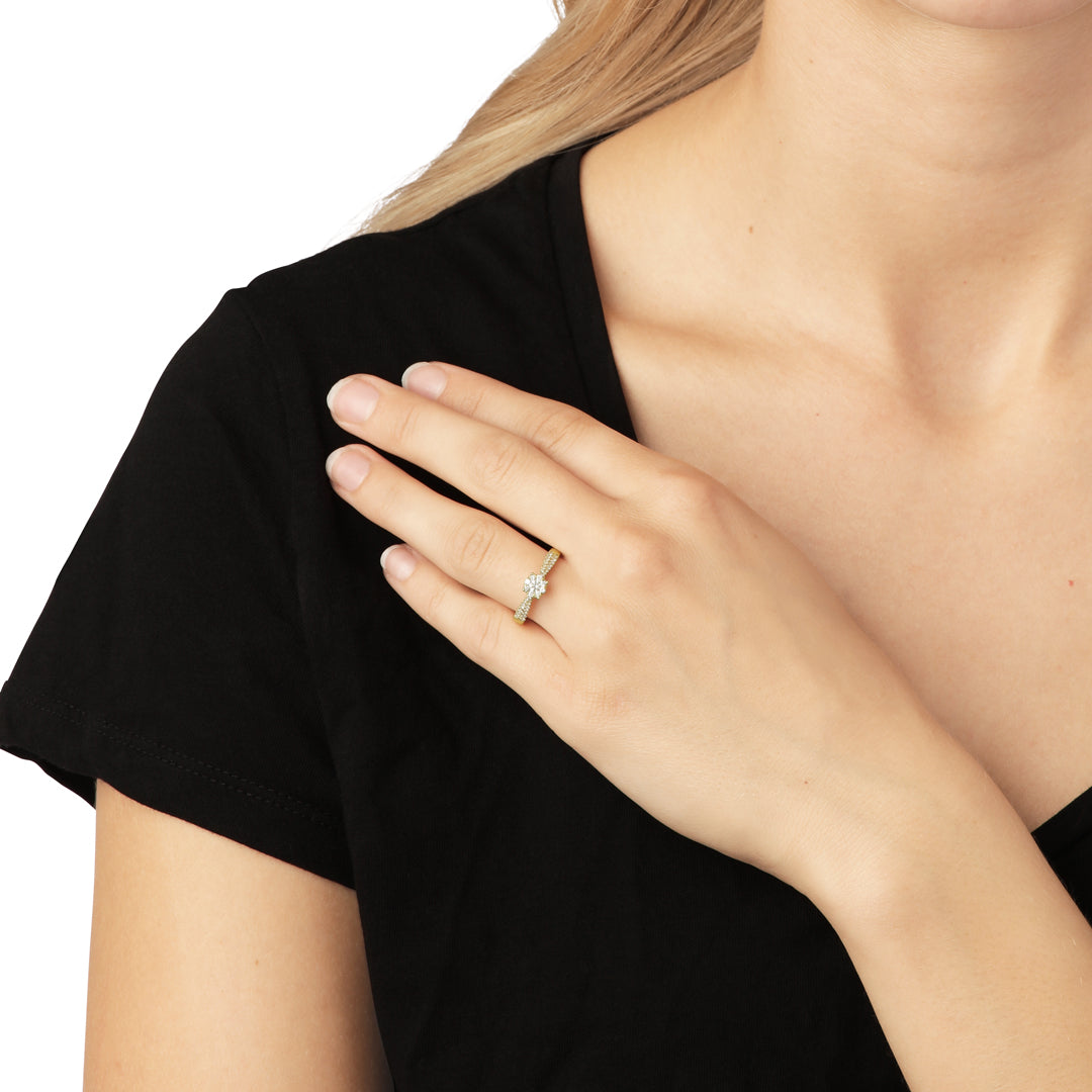 Ringen har en glat og poleret overflade, der føles behagelig mod huden. Den varme gyldne farve af 14 karat guld fremhæver diamantens klare skønhed og skaber en harmonisk balance mellem elegance og luksus. Detaljerne i designet er omhyggeligt udført for at sikre, at ringen ikke kun ser fantastisk ud, men også føles fantastisk at bære.