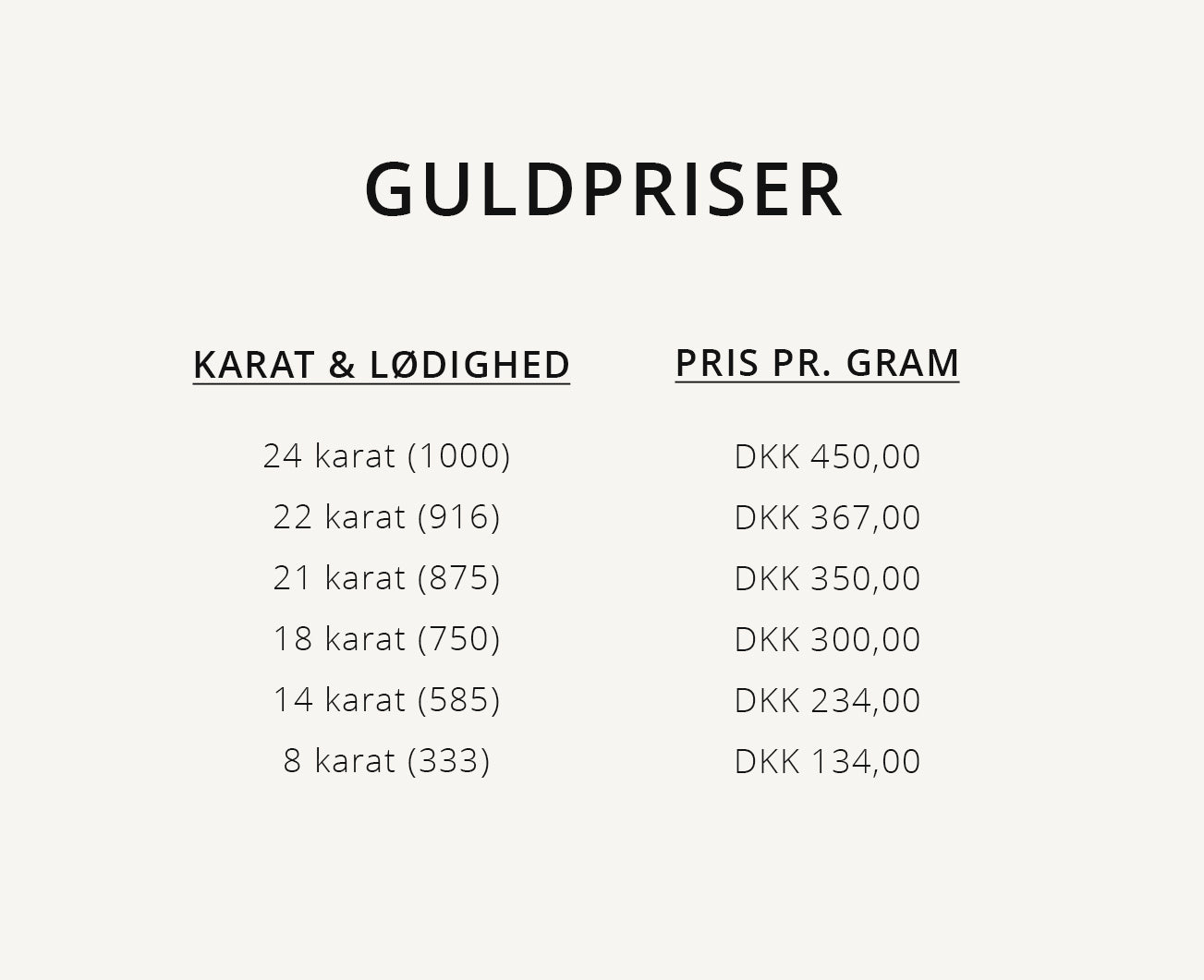 Du kan se vores guldpriser samt guldets lødighed nedenunder.