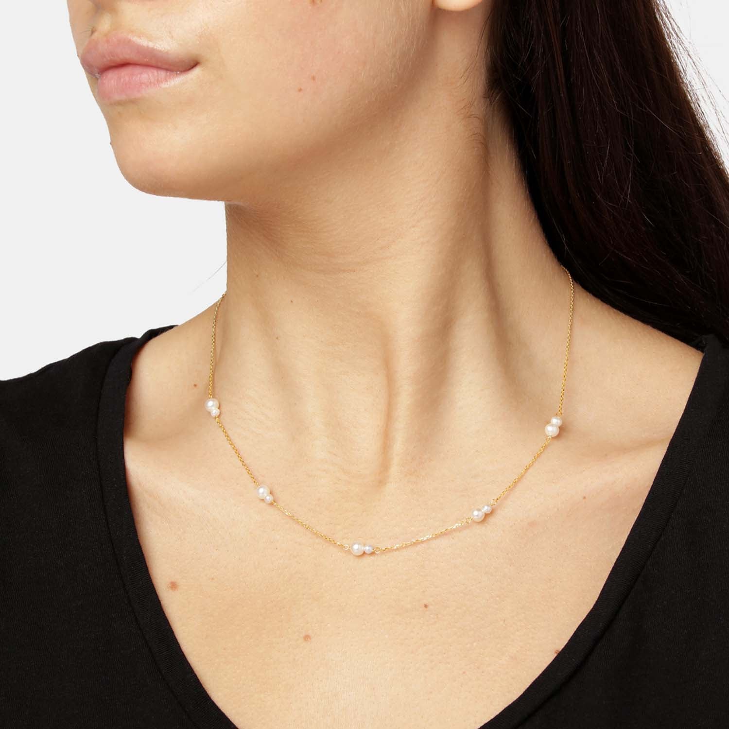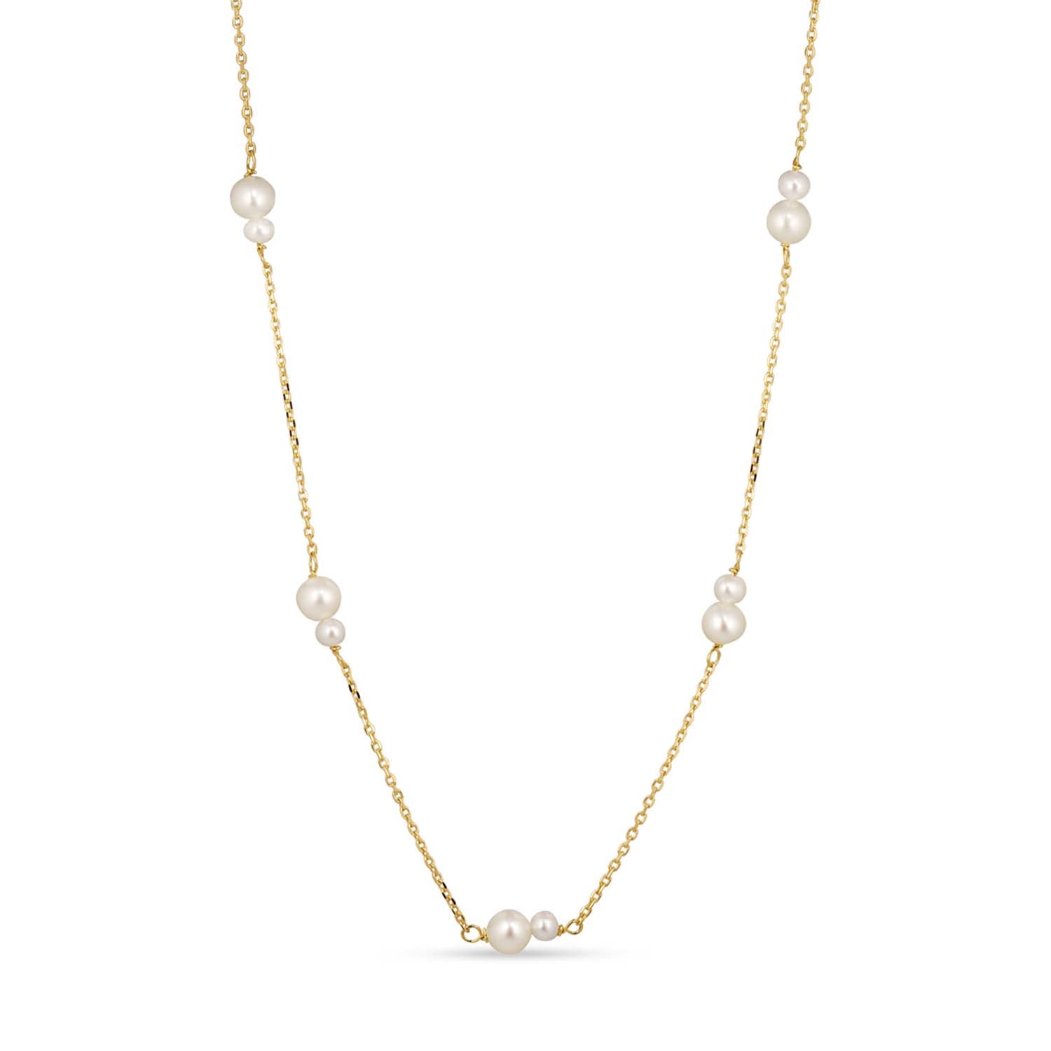 Halskæden er en fryd for øjet med sine delikate ferskvandsperler, der er jævnt fordelt langs den fine guldkæde. Den gyldne nuance af kæden komplementerer perlernes bløde glans, hvilket skaber en harmonisk balance mellem elegance og enkelhed. Når du bærer denne halskæde, vil du opleve en let og behagelig følelse mod huden, mens det subtile design gør det nemt at kombinere med andre smykker.