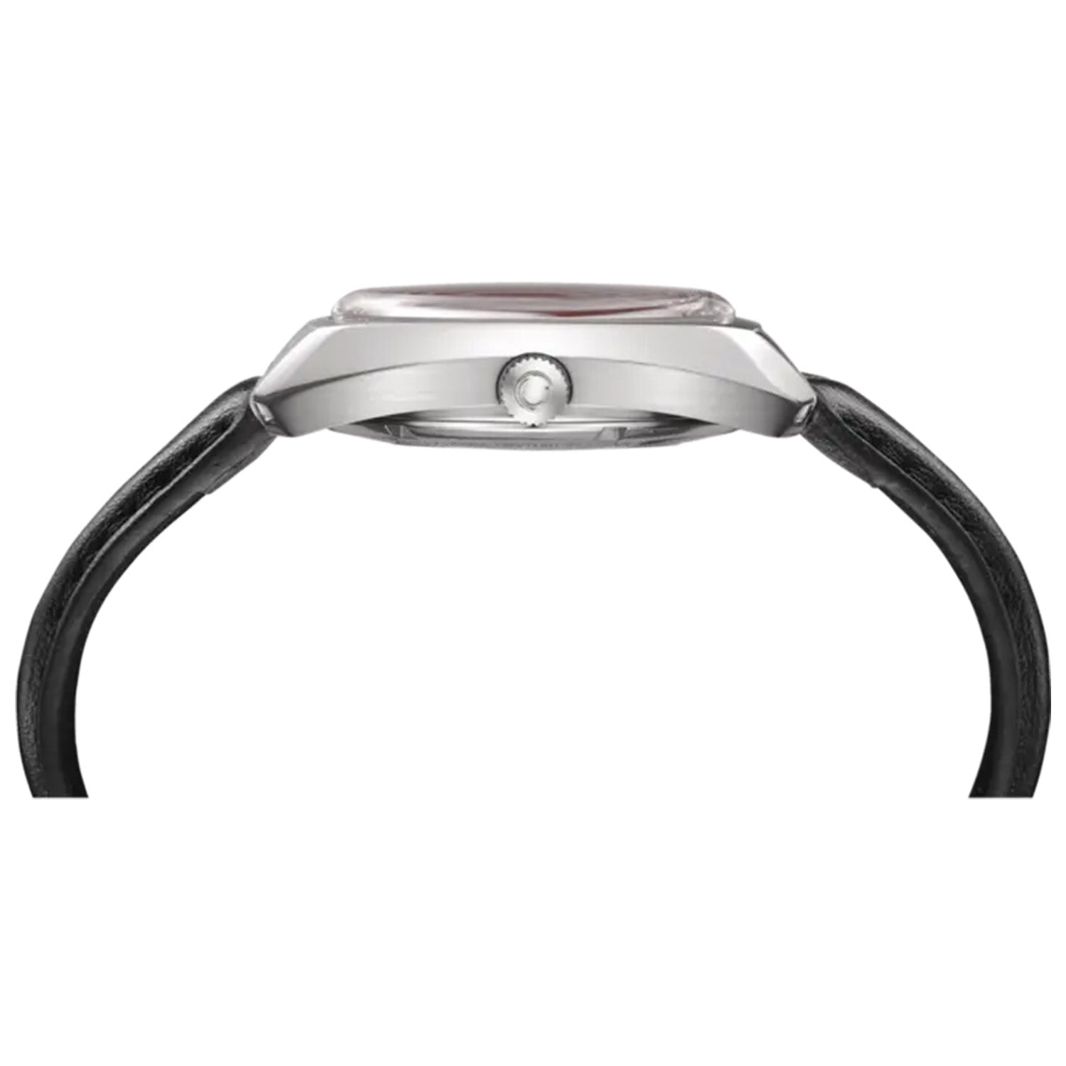 Urets design er en fryd for øjet. Den dybe røde urskive skaber en smuk kontrast til den polerede stålramme, hvilket giver et sofistikeret udtryk. De markante visere og timemarkeringer tilføjer en moderne kant, mens den sorte læderrem giver en klassisk finish. Kombinationen af disse elementer gør uret til et alsidigt tilbehør, der passer til både formelle og afslappede lejligheder.