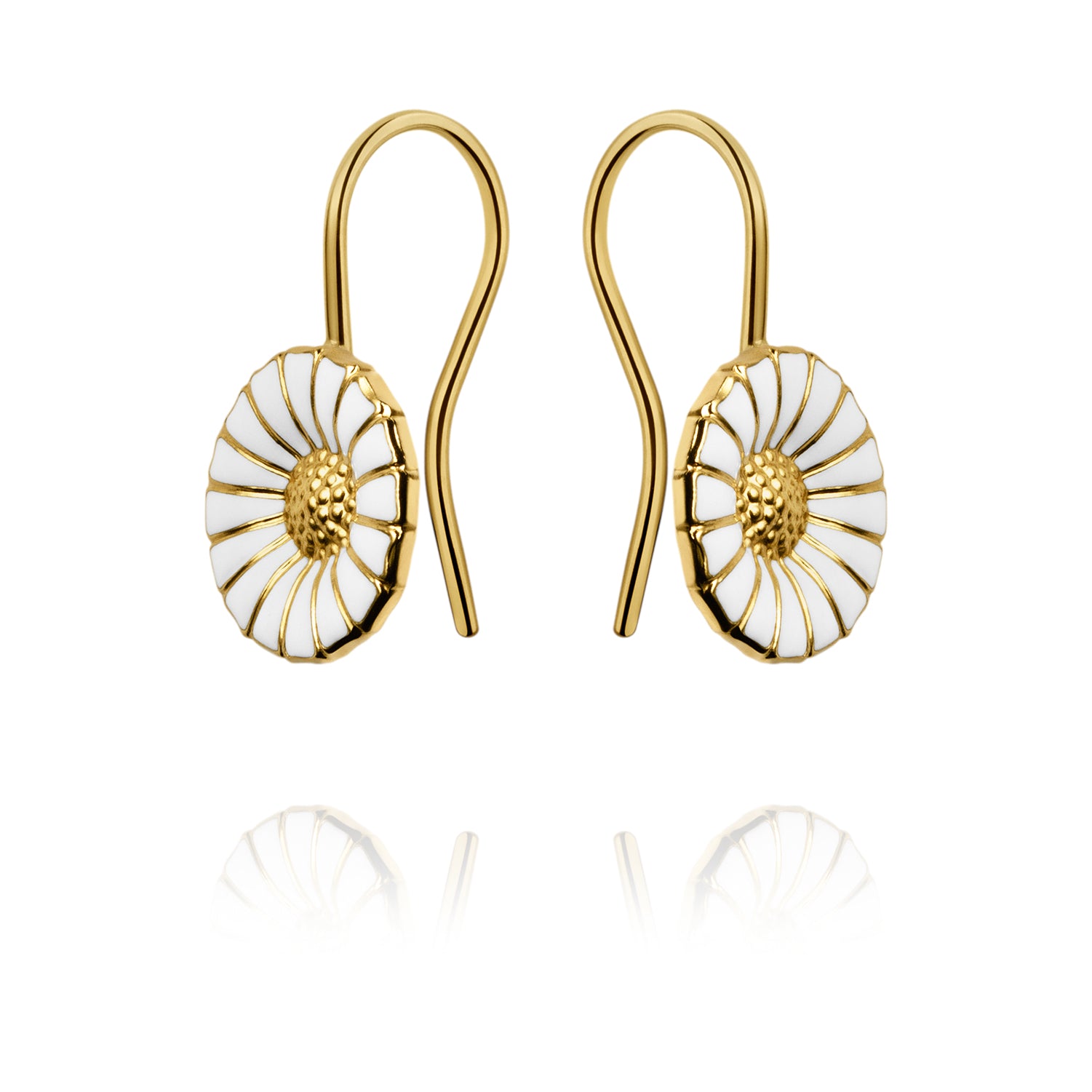 Disse ørebøjler er udført i en smuk kombination af gyldne nuancer og hvid emalje, der minder om en friskblomstret marguerit. Den detaljerede udformning af blomsterbladene giver et sofistikeret og naturligt udtryk. Den gyldne finish tilføjer et strejf af luksus, mens den hvide emalje skaber en frisk og ren kontrast.