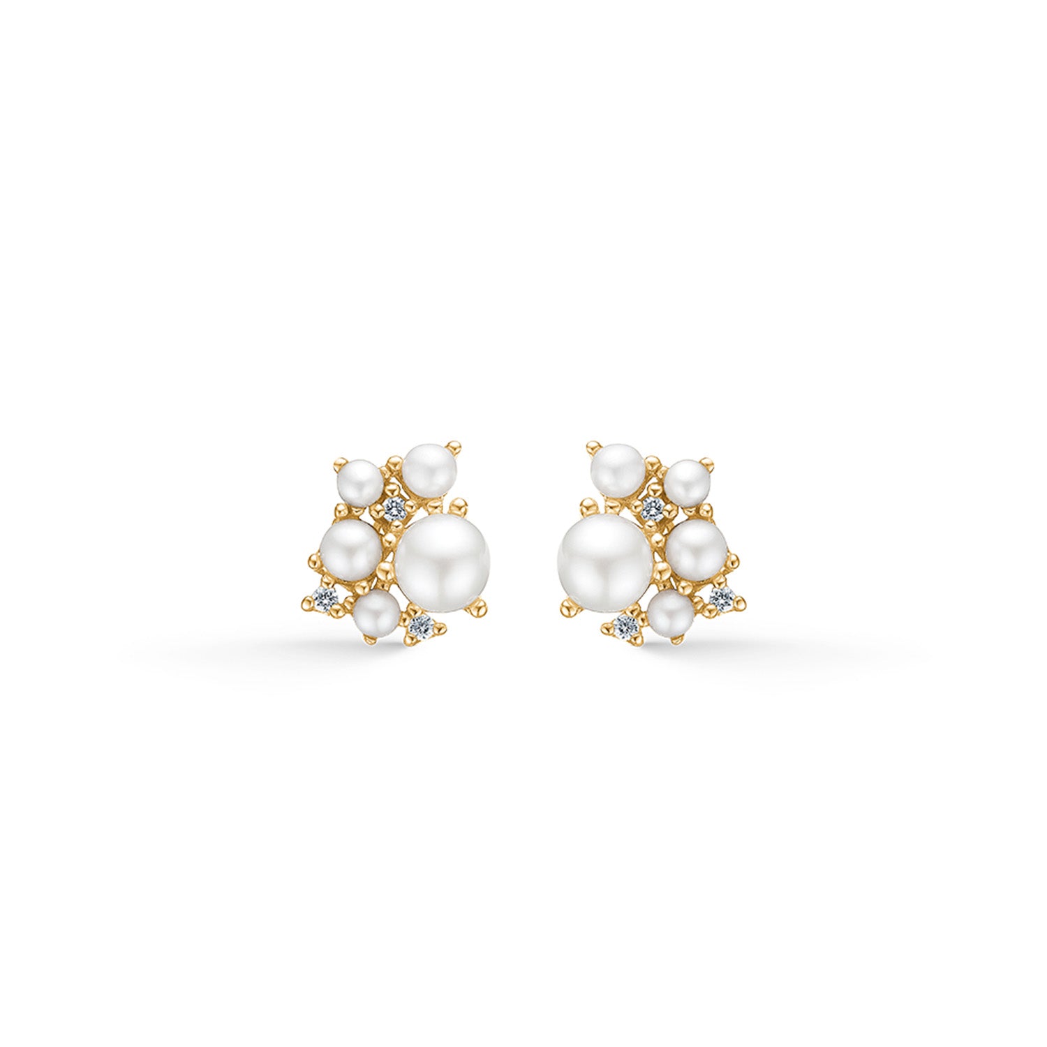 Disse ørestikker er en visuel fryd med deres delikate sammensætning af perler og funklende sten. Den gyldne nuance af 18 karat guld skaber en varm glød, der fremhæver de smukke perler og sten. Designet minder om en sky af diamanter, der elegant pryder øret og tilføjer et strejf af glamour til dit look.