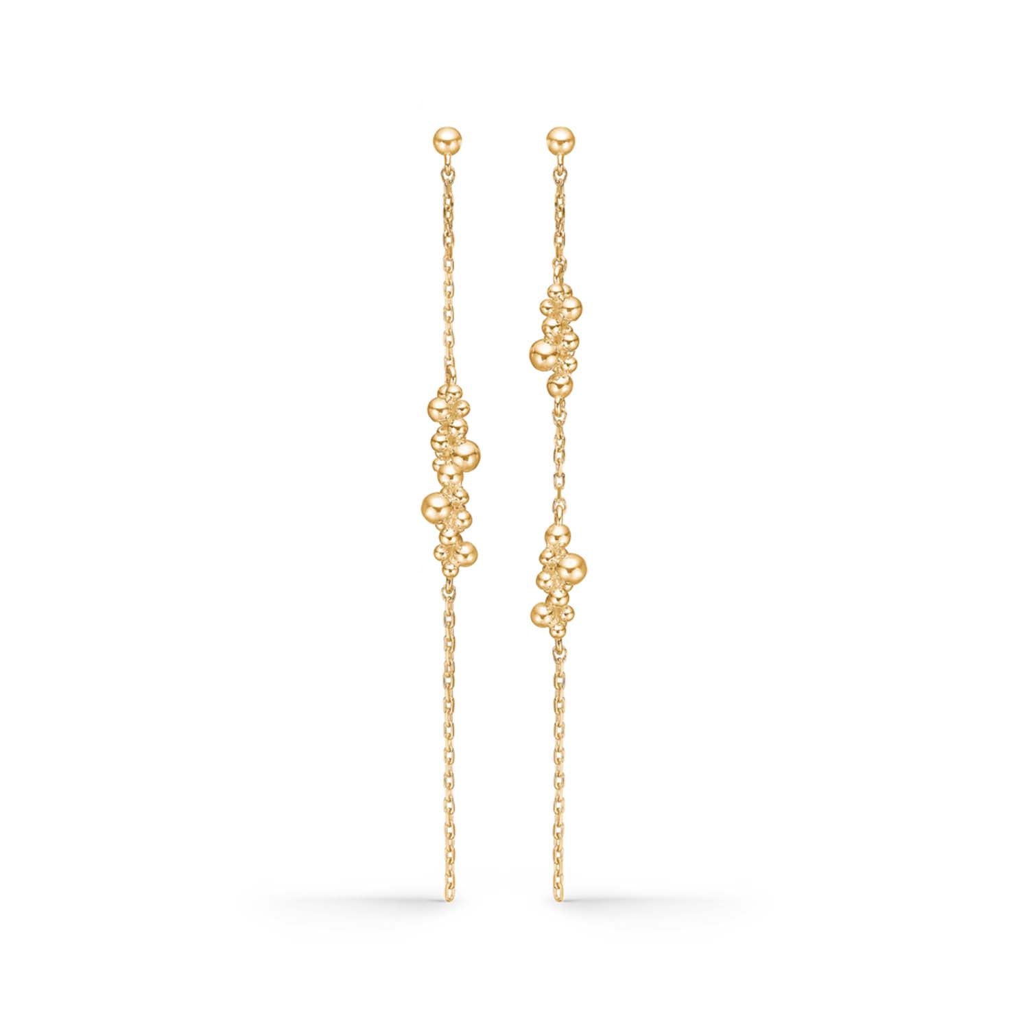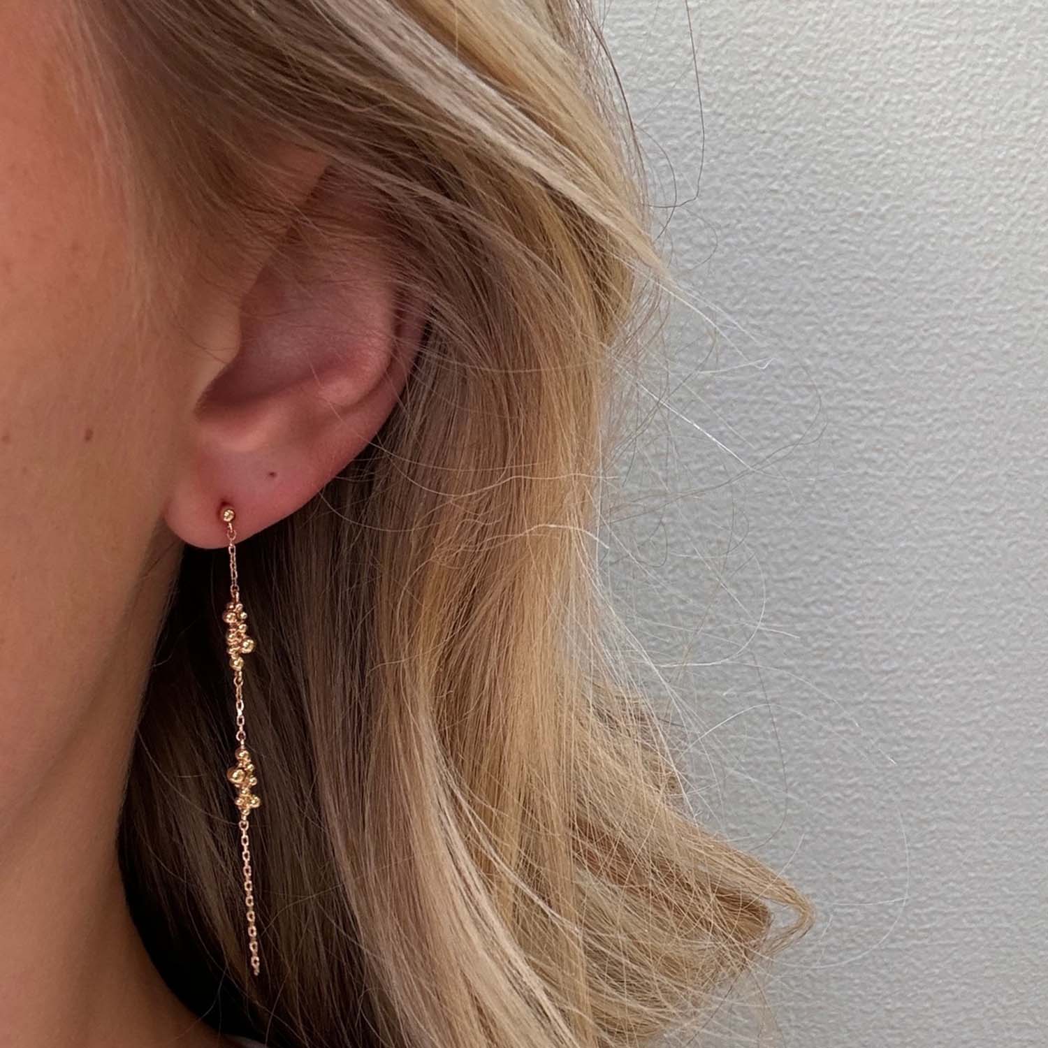 Den fine kæde og de små kugler giver en let og luftig følelse, der gør dem behagelige at bære hele dagen. Ørehængerne er lange og slanke, hvilket giver en forførende bevægelse, når du bevæger dig. De er perfekte til at fremhæve din naturlige skønhed og tilføje et strejf af glamour til enhver garderobe.