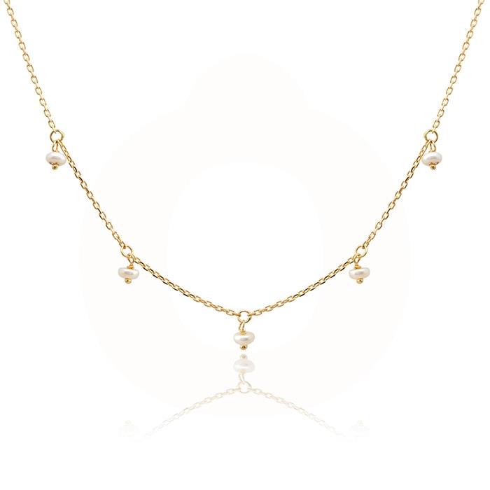 Dette collier er en fryd for øjet med sine delikate ferskvandsperler, der hænger yndefuldt fra en fin guldkæde. Den gyldne nuance af kæden fremhæver perlernes naturlige glans og skaber en harmonisk balance mellem elegance og enkelhed. Hver perle er unik, hvilket giver smykket en personlig og autentisk følelse.